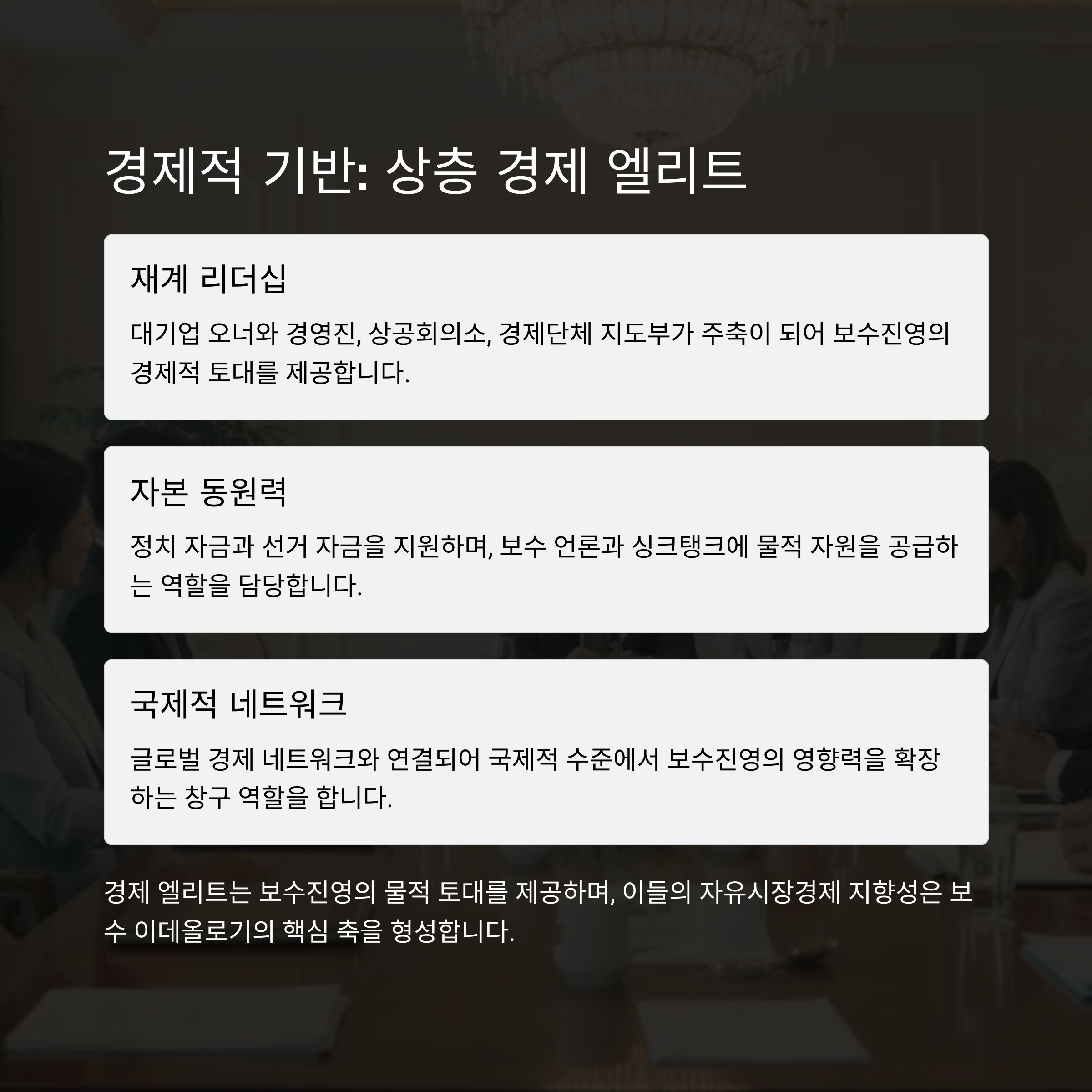 | ② 상층 경제 엘리트 | 대기업 오너, 상공회의소, 재계 핵심 | 10~15% |
