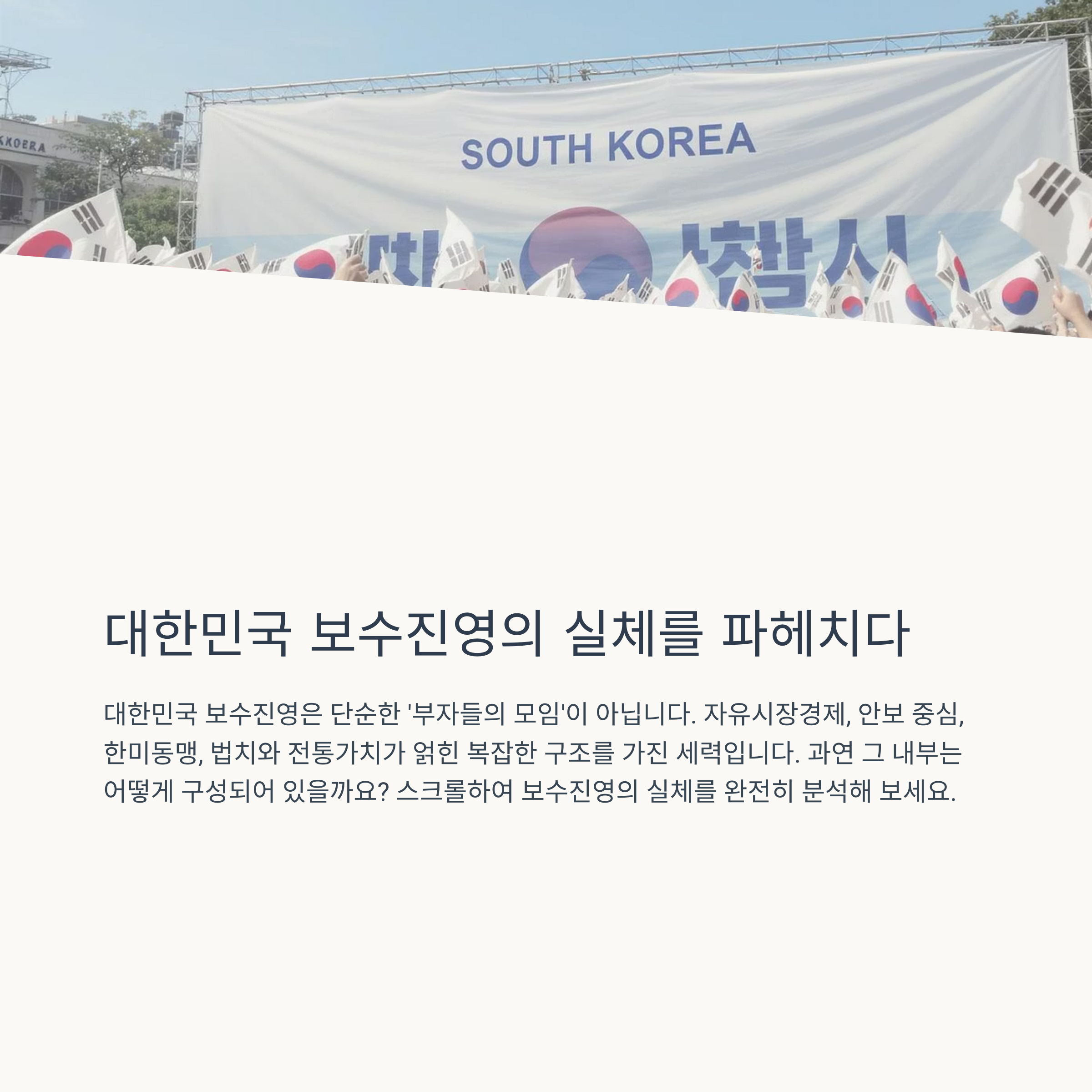 대한민국 보수진영은 단순히 '부자'나 '기득권'으로만 설명되지 않습니다. 자유시장경제, 안보 중심, 한미동맹 중시, 공정·법치·전통가치 존중이라는 핵심 가치 아래 다양한 계층이 결집해 있습니다. 재계 엘리트부터 지역 기반층, 신앙 보수층, 안보세력, 고령층까지 폭넓은 스펙트럼을 지니며, 세대교체 속에서도 끊임없이 변화를 거듭하고 있습니다.