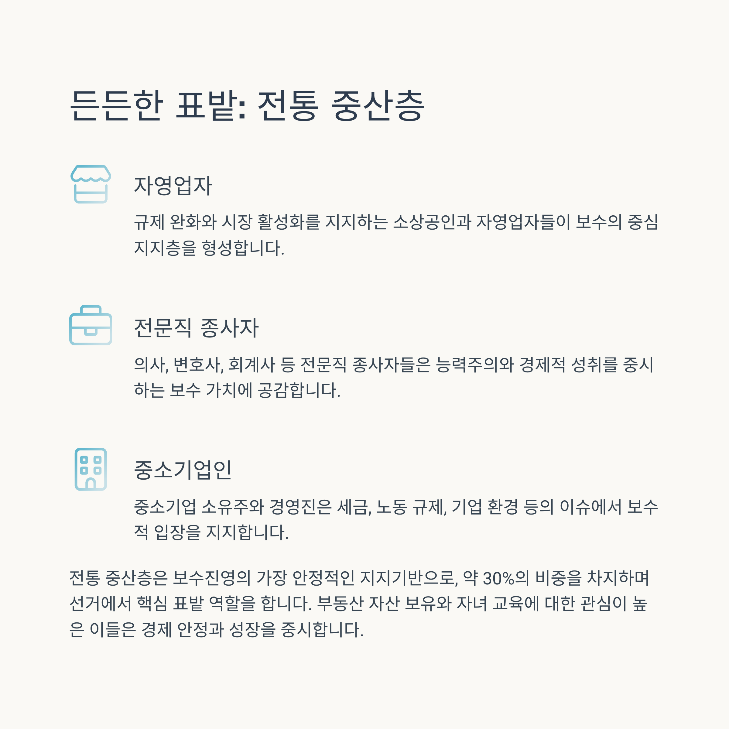 | ③ 전통 중산층 | 자영업, 전문직, 중소기업 종사자 | 30% |