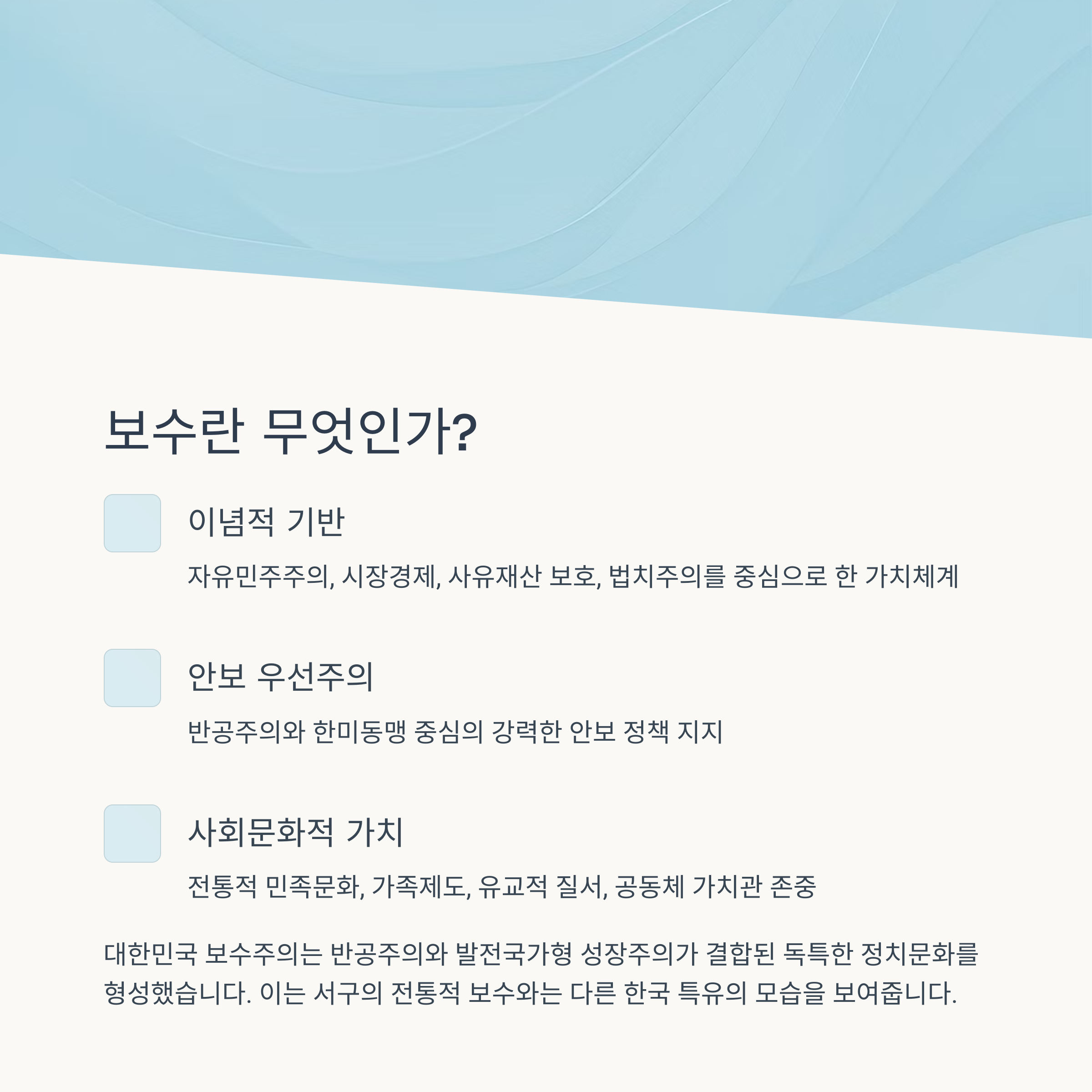 보수진영은 자유민주주의·시장경제·사유재산 보호·법치주의·안보 우선주의·반공주의·전통가치 존중을 핵심 이념으로 삼습니다. 사회문화적으로는 민족문화, 가족제도, 유교적 질서, 공동체 가치관을 중시합니다. 대한민국 보수주의는 반공주의와 발전국가형 성장주의를 결합하며 독특한 정치문화를 만들어왔습니다.