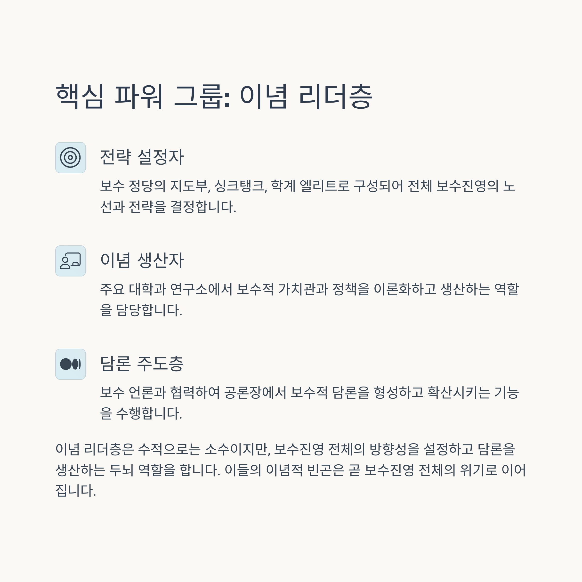 | ① 이념 리더층 | 보수정당 지도부, 경제학자, 안보·외교 엘리트 | 5% |