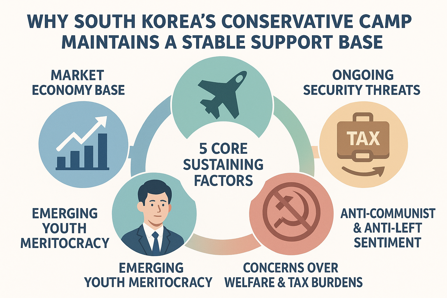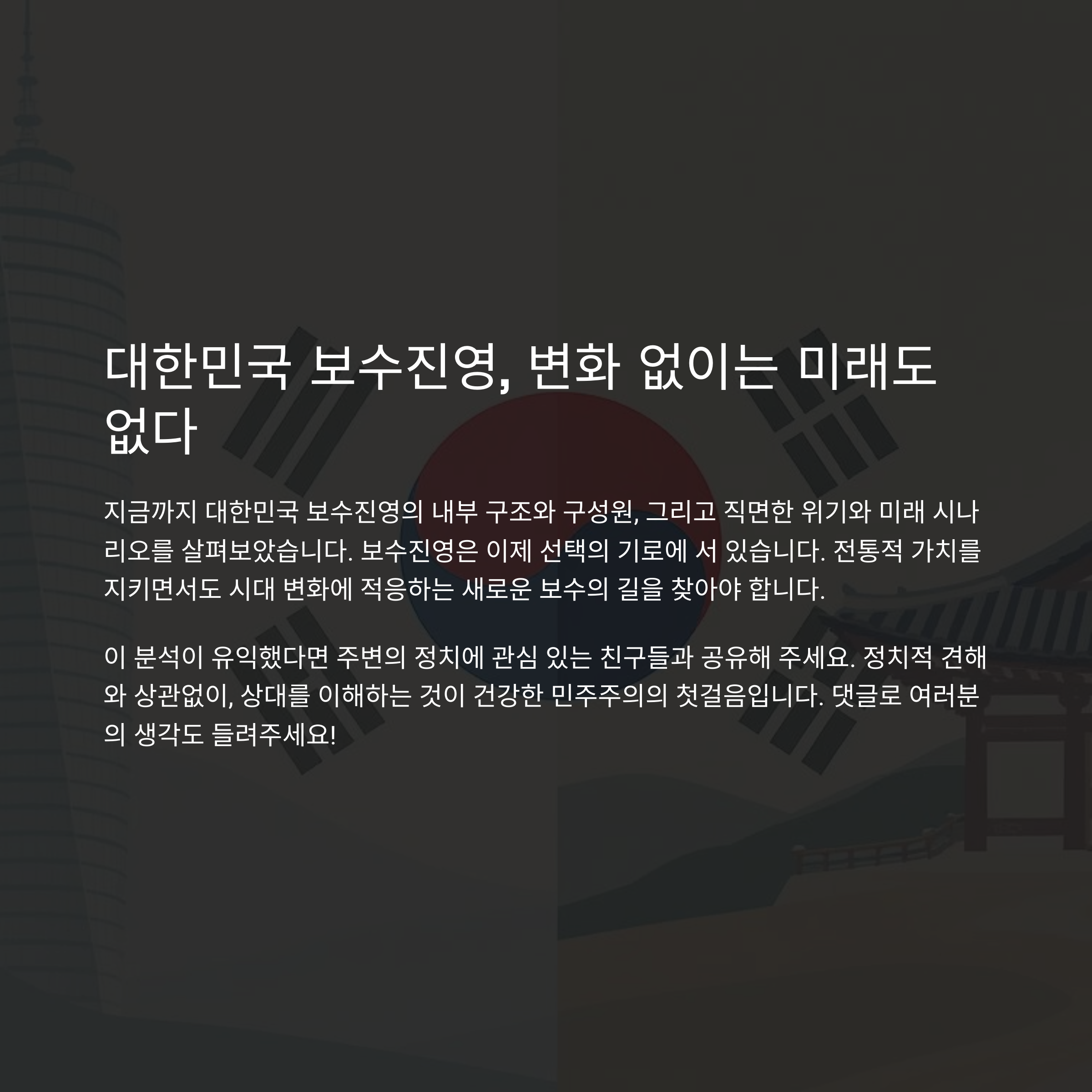 대한민국 보수진영은 시장경제, 안보우선, 전통가치 보호를 기치로 다양한 세력이 복합적으로 존재합니다. 리더그룹이 이념과 전략을 설정하고, 기업 엘리트가 자본을, 중산층이 표를, 안보·종교·고령층이 정서를 결속시키며, 청년 신공정 세대가 새 흐름을 만들고 있습니다. 그러나 내부 분화와 이념적 혼란, 지역기반 약화라는 위기 요인도 존재합니다.
