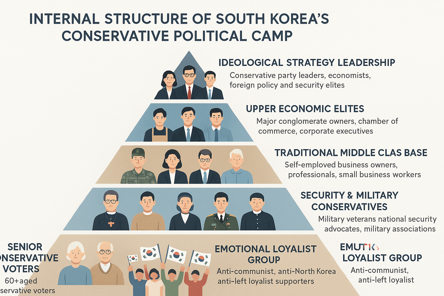 대한민국 보수진영은 이념·전략·경제·정서가 입체적으로 얽힌 복합 피라미드 구조를 이룹니다. 정점의 전략 이념그룹이 노선을 결정하고, 경제 엘리트가 물적 토대를 제공하며, 중산층과 고령층이 안정적 표를 형성하고, 종교·군사·감정적 충성층이 결속을 뒷받침합니다.