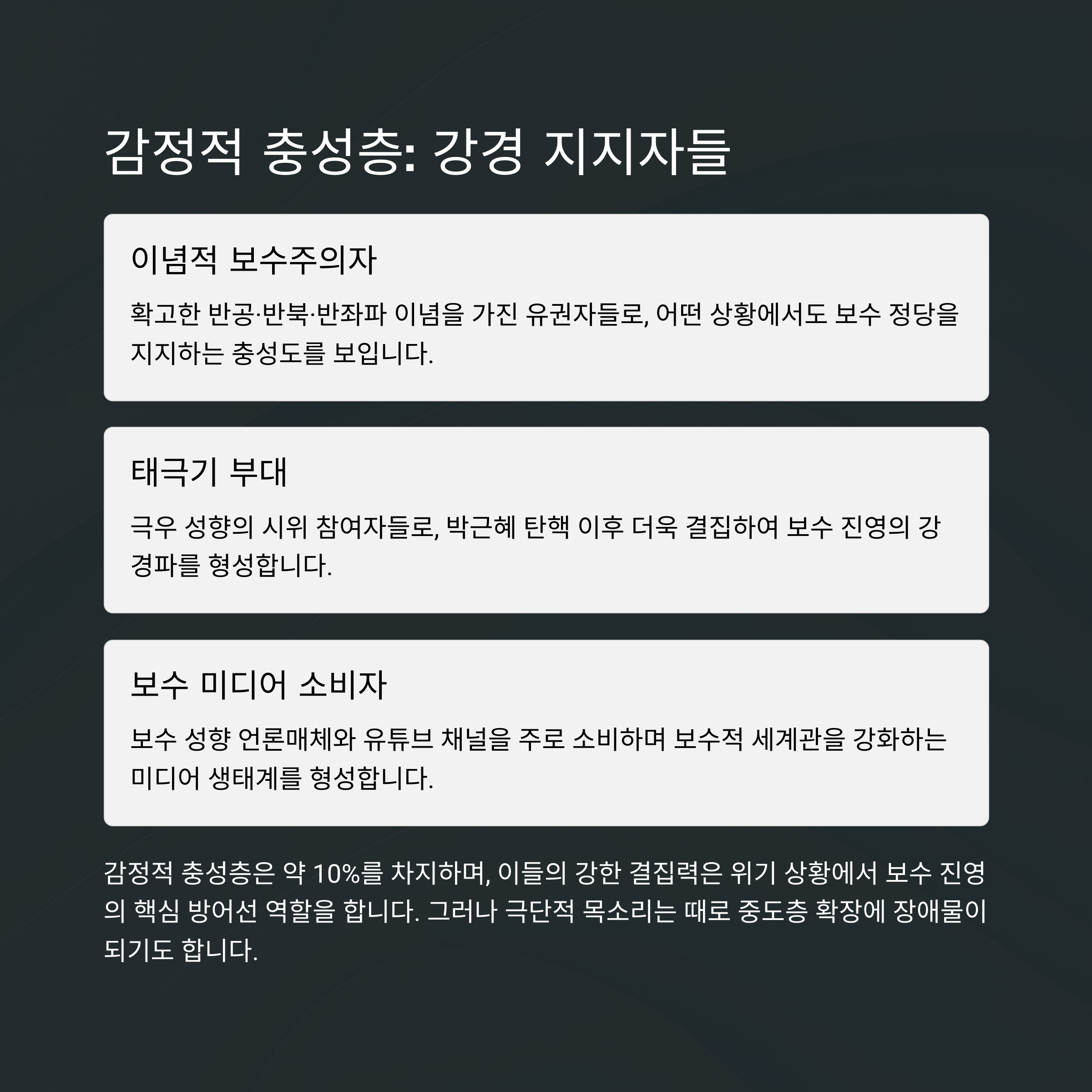 | ⑦ 감정 충성층 | 반공, 반북, 반좌파 충성 유권자 | 10% |