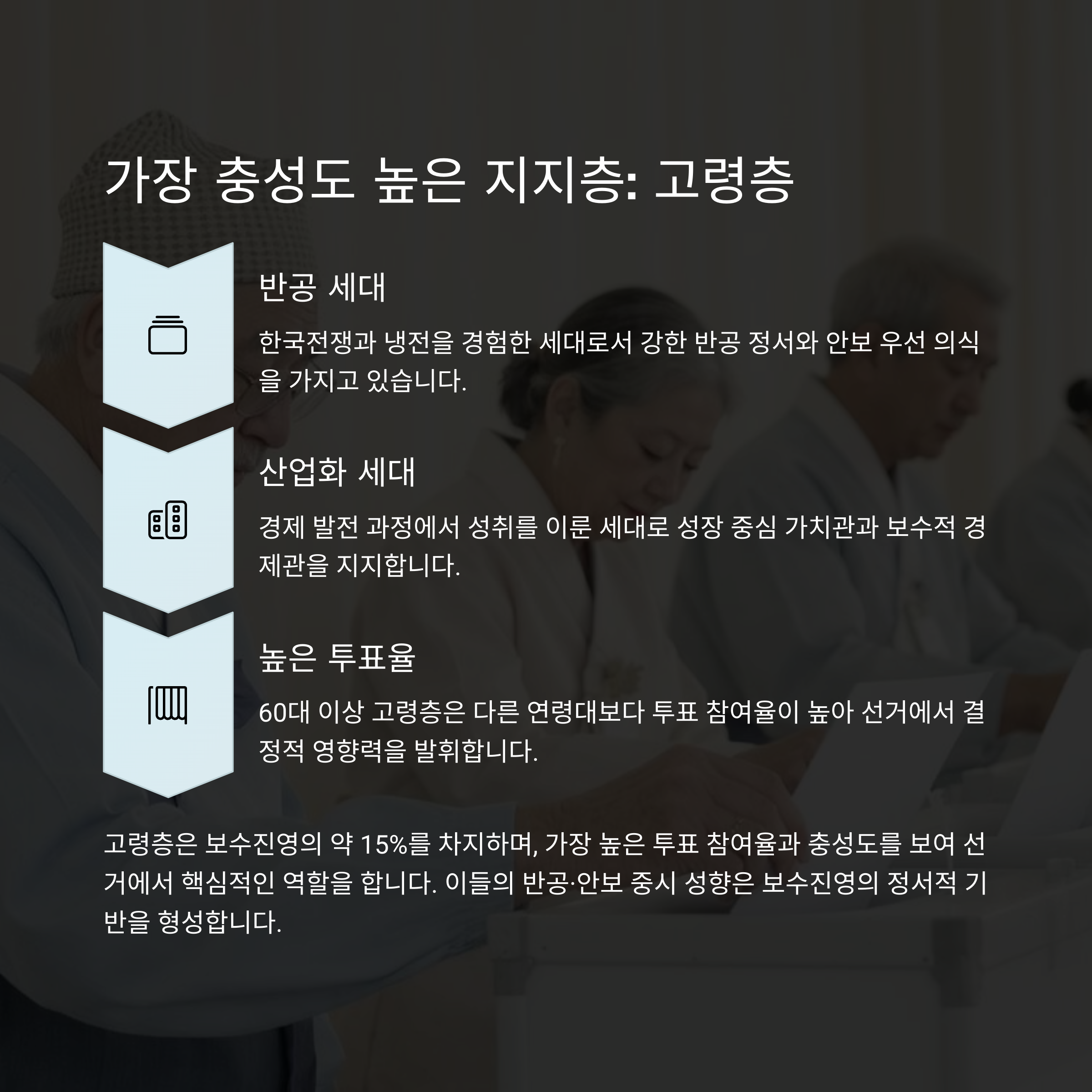| ④ 안보·군사층 | 군인 출신, 보훈세력, 강경 안보파 | 10% |