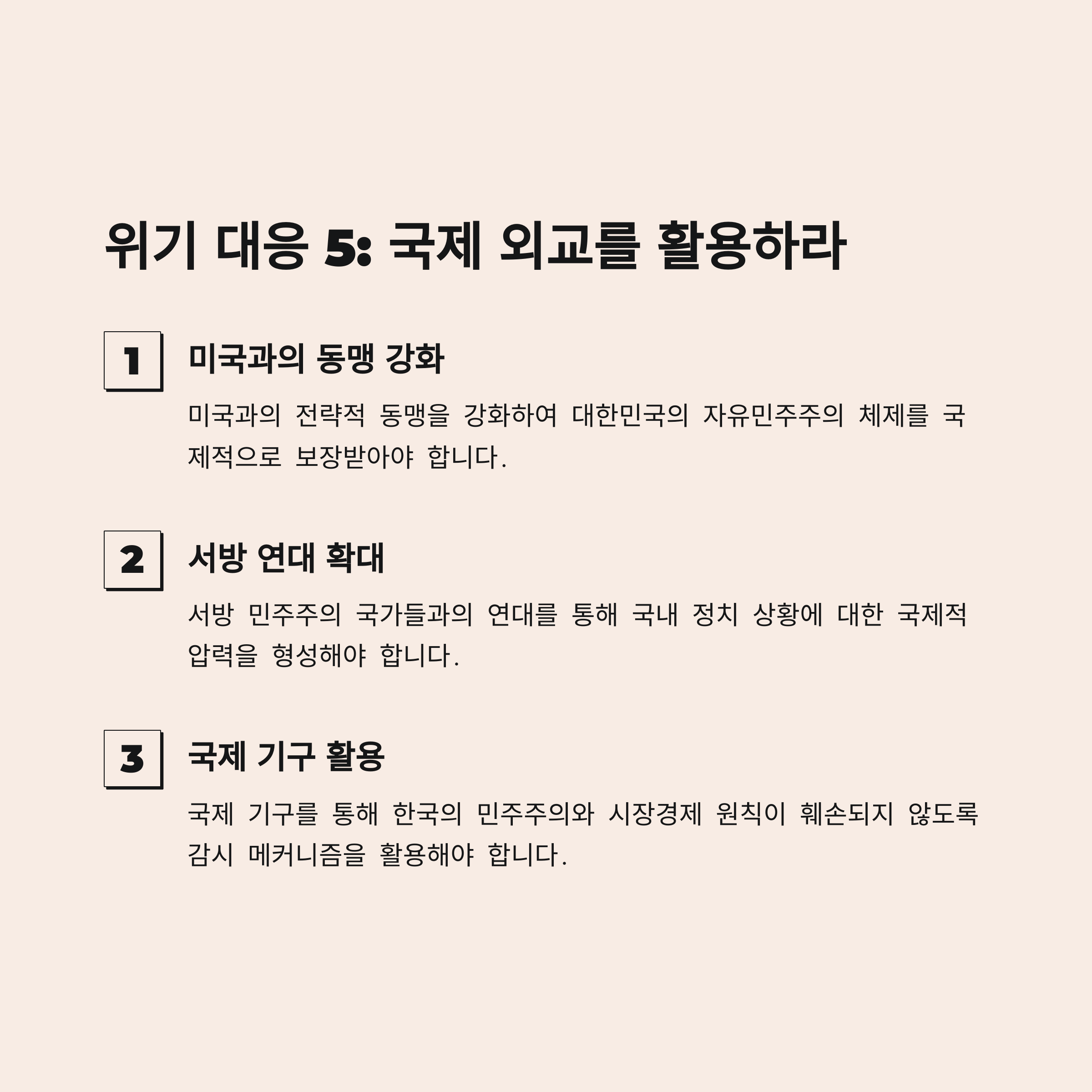 핵심 대응: 정보전쟁 승리, 정치 균형 복원, 사법 견제, 경제기반 방어, 국제외교 활용