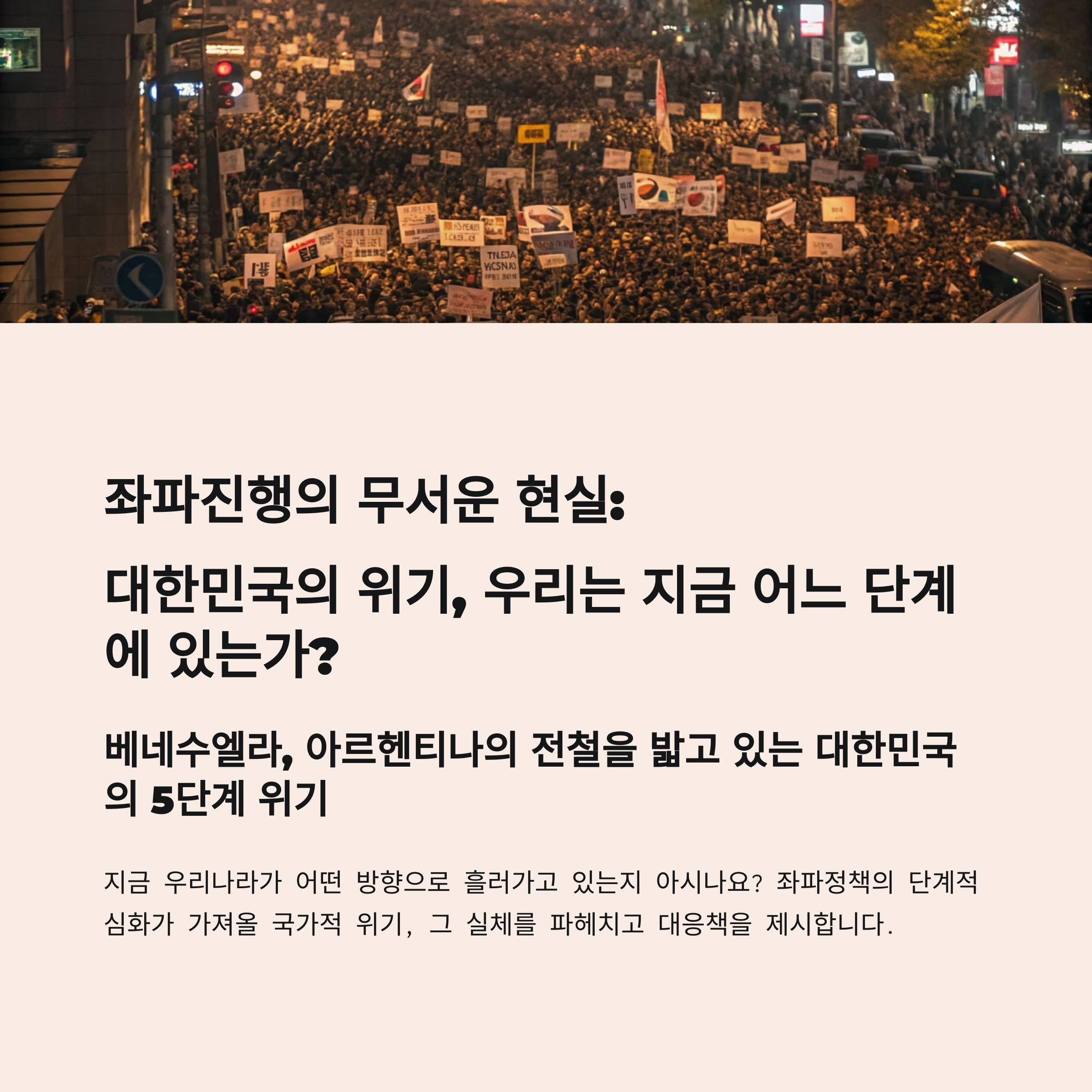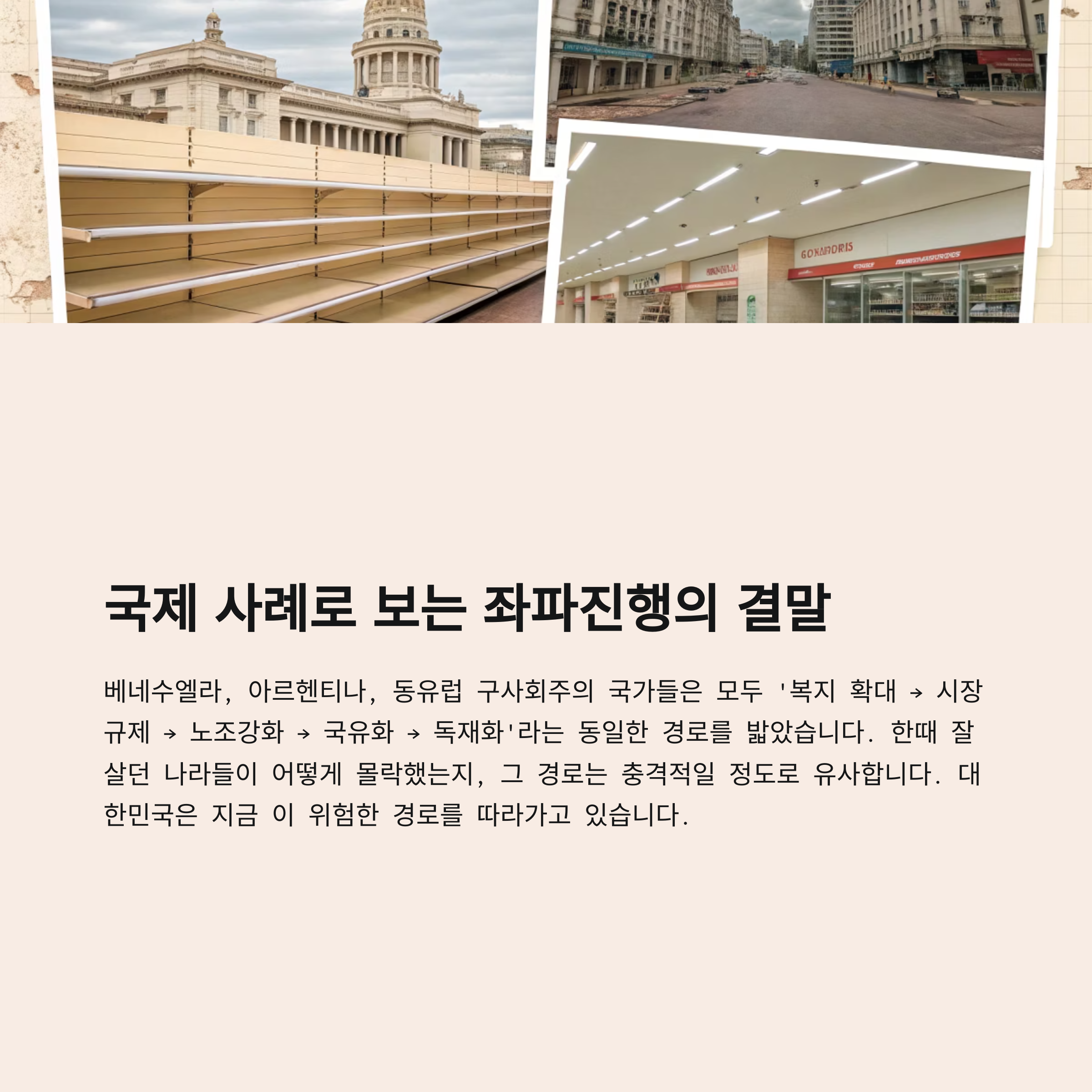 지금 대한민국이 어떤 방향으로 흘러가고 있는지 우려의 목소리가 커지고 있습니다. 복지확대, 규제강화, 기업이탈 등 좌파정책의 단계적 심화가 진행되고 있고, 그 결과는 국제사례에서도 확인됩니다. 이미 베네수엘라, 아르헨티나, 동유럽 구사회주의 국가들이 이를 경험했으며, 대한민국은 유사한 경로를 밟고 있습니다.