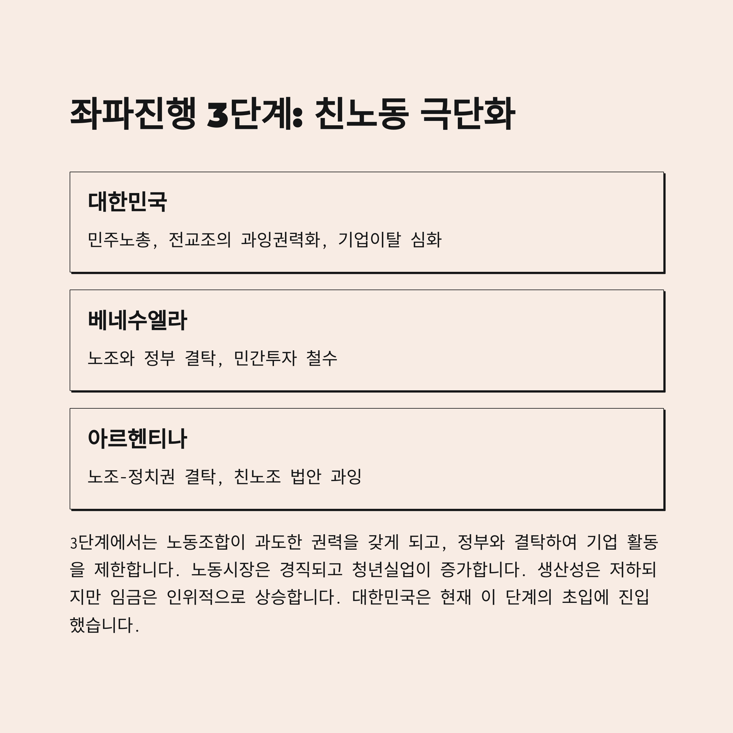 | 3단계 | 노조 권력화 | 친노조 과잉 | 국가노조화 | 민주노총 확장 |