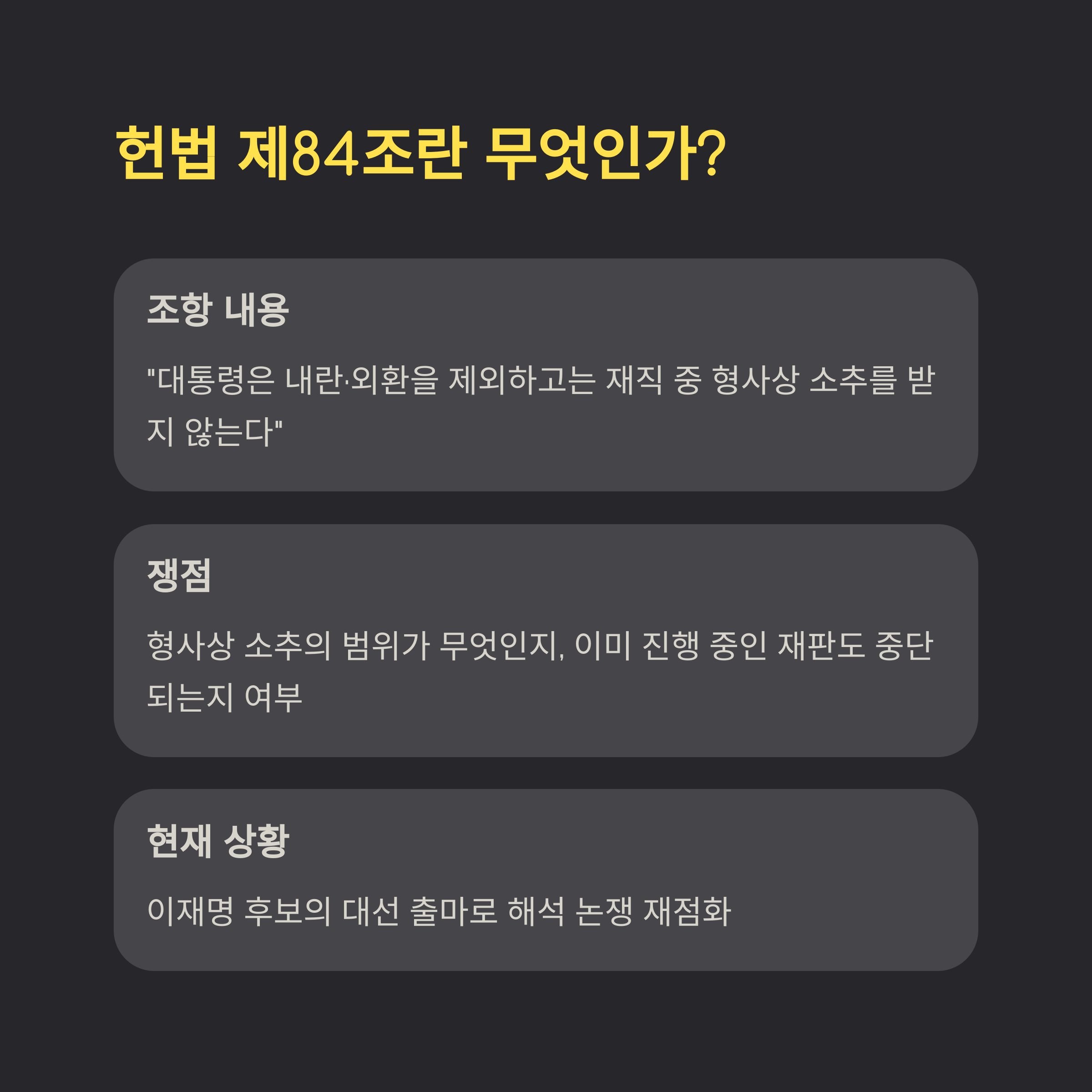 - 헌법 84조는 대통령 재직 중 ‘형사소추 금지’ 조항