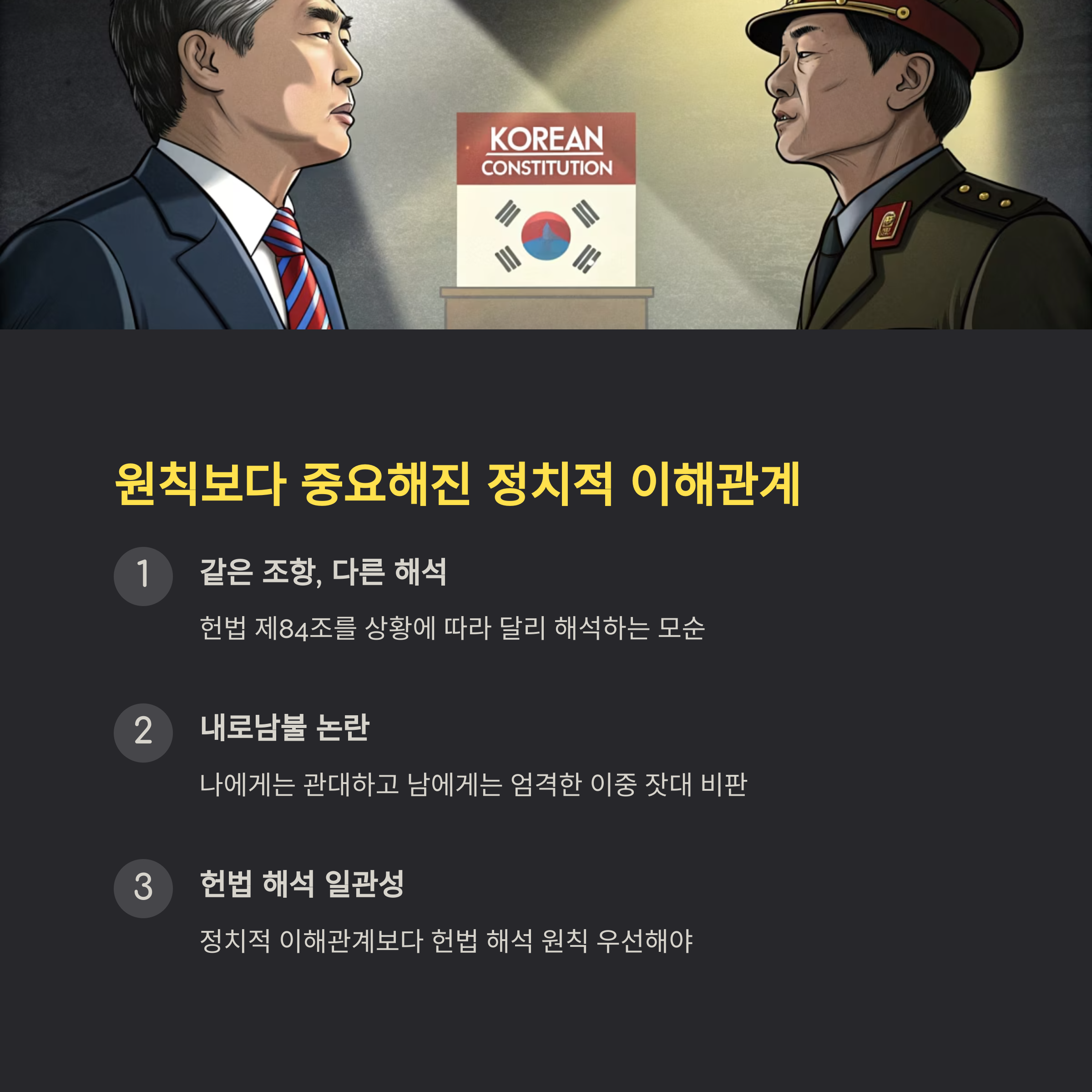 헌법 84조는 여전히 명확히 해석되지 않은 조항입니다. 그러나 최소한 정당이라면 과거의 발언에 책임을 지고 일관된 태도를 유지해야 합니다. 유권자는 이런 ‘내로남불 정치’에 점점 피로감을 느끼고 있으며, 언행 불일치에 대한 응답은 결국 투표로 나타날 것입니다.