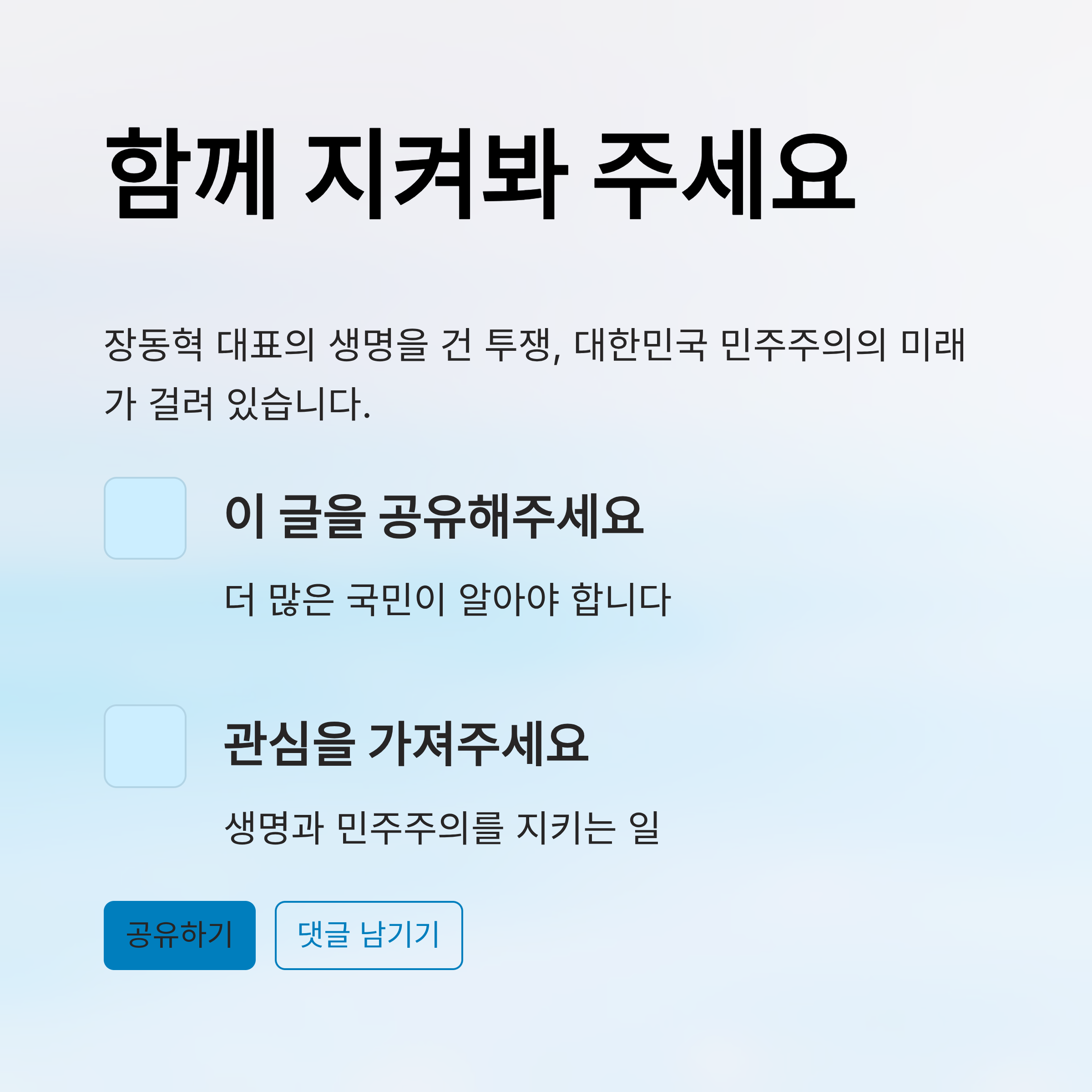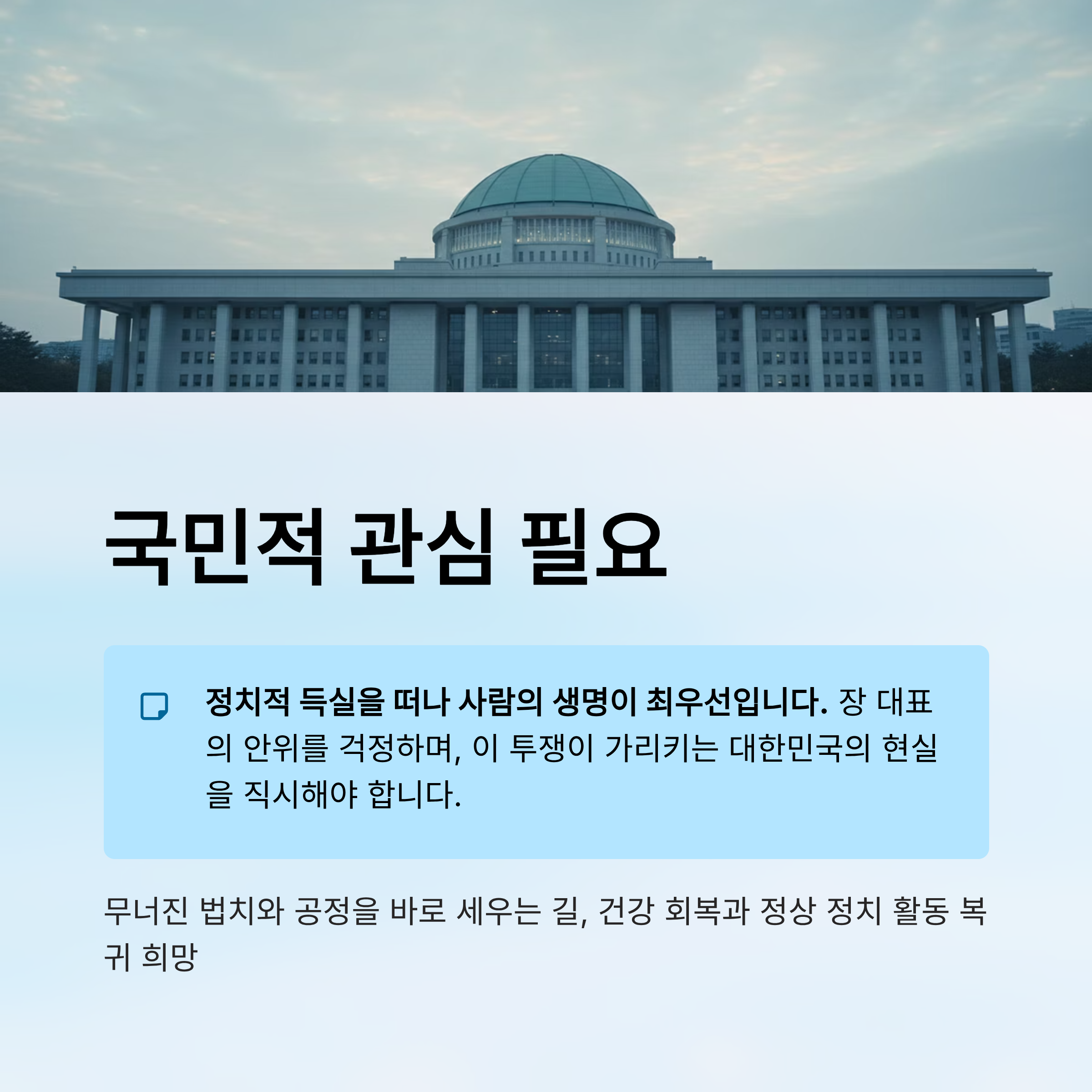 장동혁 대표의 단식은 단순한 정치적 의사 표시를 넘어 생명을 담보로 한 최후의 저항 수단이 되고 있습니다. 현재 의료진이 경고하는 뇌 후유증과 생명의 위협은 실재하는 공포이며, 이를 감내하는 장 대표의 결기는 보수 진영의 결집을 넘어 정국에 거대한 파동을 일으키고 있습니다. 이재명 정부와 거대 여당은 이러한 목숨 건 외침을 단순한 정치 쇼로 치부해서는 안 됩니다. '절대 권력은 절대 부패한다'는 명제 아래, 특검 요구와 전 정권에 대한 과도한 탄압 중단이라는 메시지는 무겁게 다루어져야 합니다. 무엇보다 정치적 득실을 떠나 사람의 생명을 최우선으로 하는 인도적 조치와 대화의 장이 시급합니다. 장 대표가 건강을 회복하고 정상적인 정치 활동으로 복귀하여, 무너진 법치와 공정을 바로 세우는 길에 다시 설 수 있기를 강력히 희망합니다. 독자 여러분께서도 장 대표의 안위를 함께 걱정하며, 이 투쟁이 가리키는 대한민국의 현실을 직시해주시길 바랍니다.