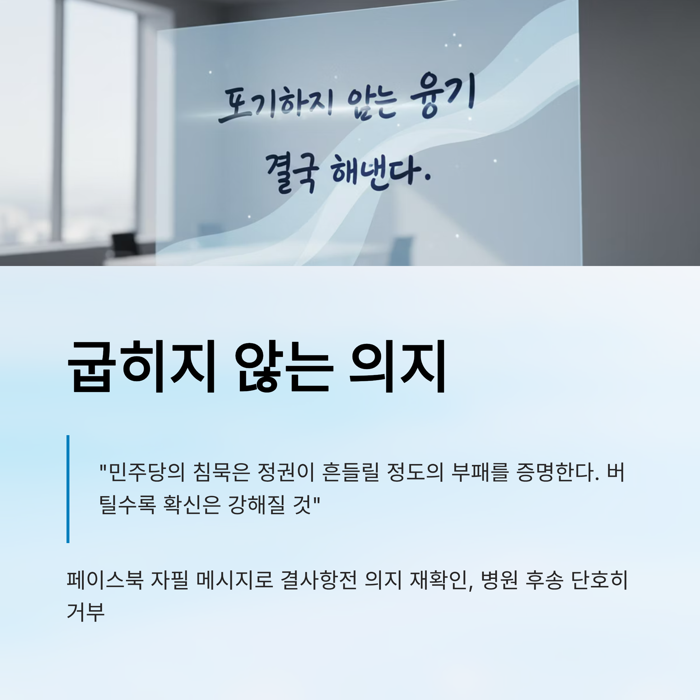 투쟁 의지: 페이스북 자필 메시지를 통해 "민주당의 침묵은 정권이 흔들릴 정도의 부패를 증명한다"며 "버틸수록 확신은 강해질 것"이라고 밝히며 결사항전의 뜻을 재확인했습니다.