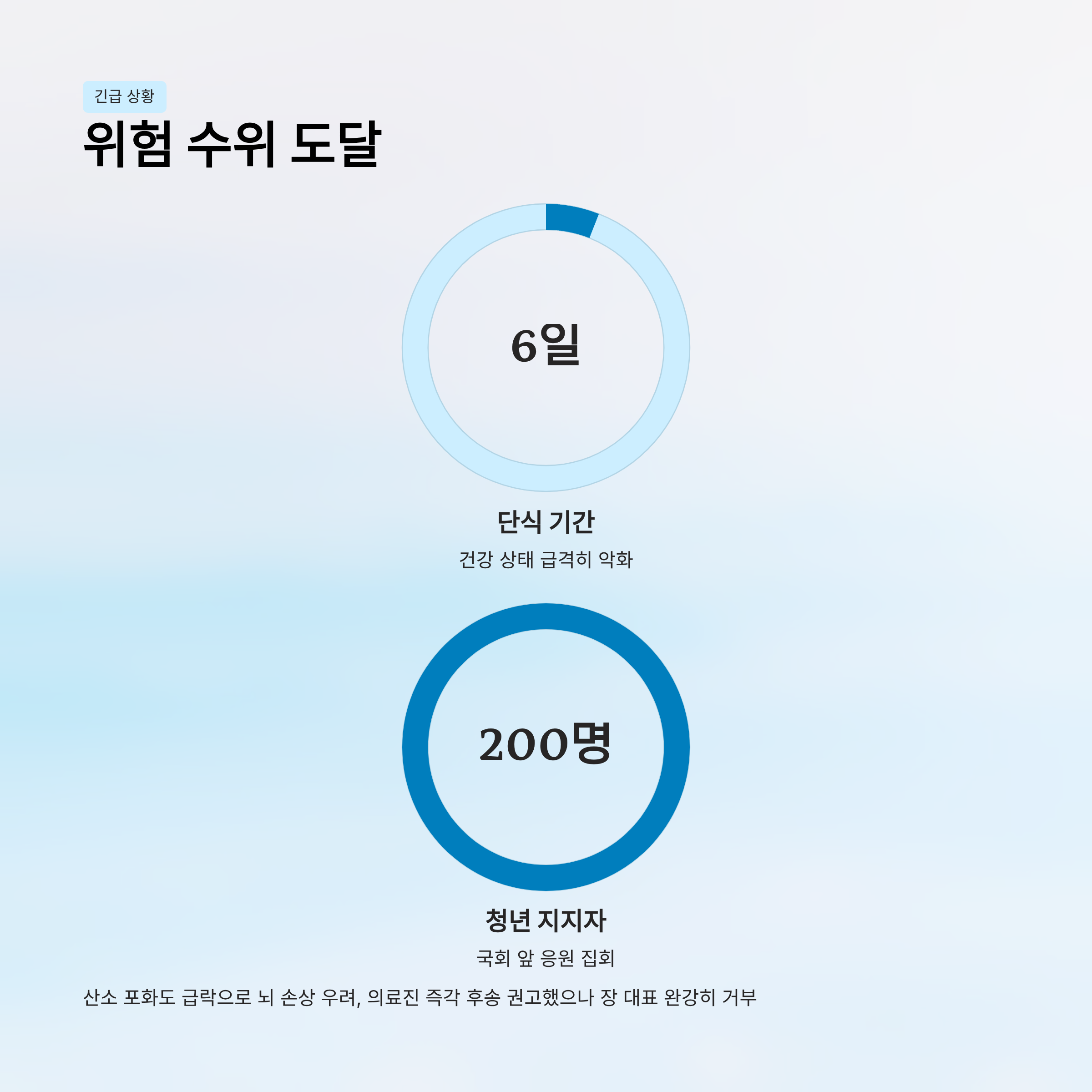 | A. 단식 6일 차에 접어들며 산소 포화도가 급격히 떨어지고 바이탈 사인이 매우 불안정해 의료진이 위험 수위로 판정했습니다. 뇌 후유증 우려로 병원 후송을 권고받았으나 본인이 거부 중이며, 대화가 불가능해 고개만 끄덕일 정도입니다. |