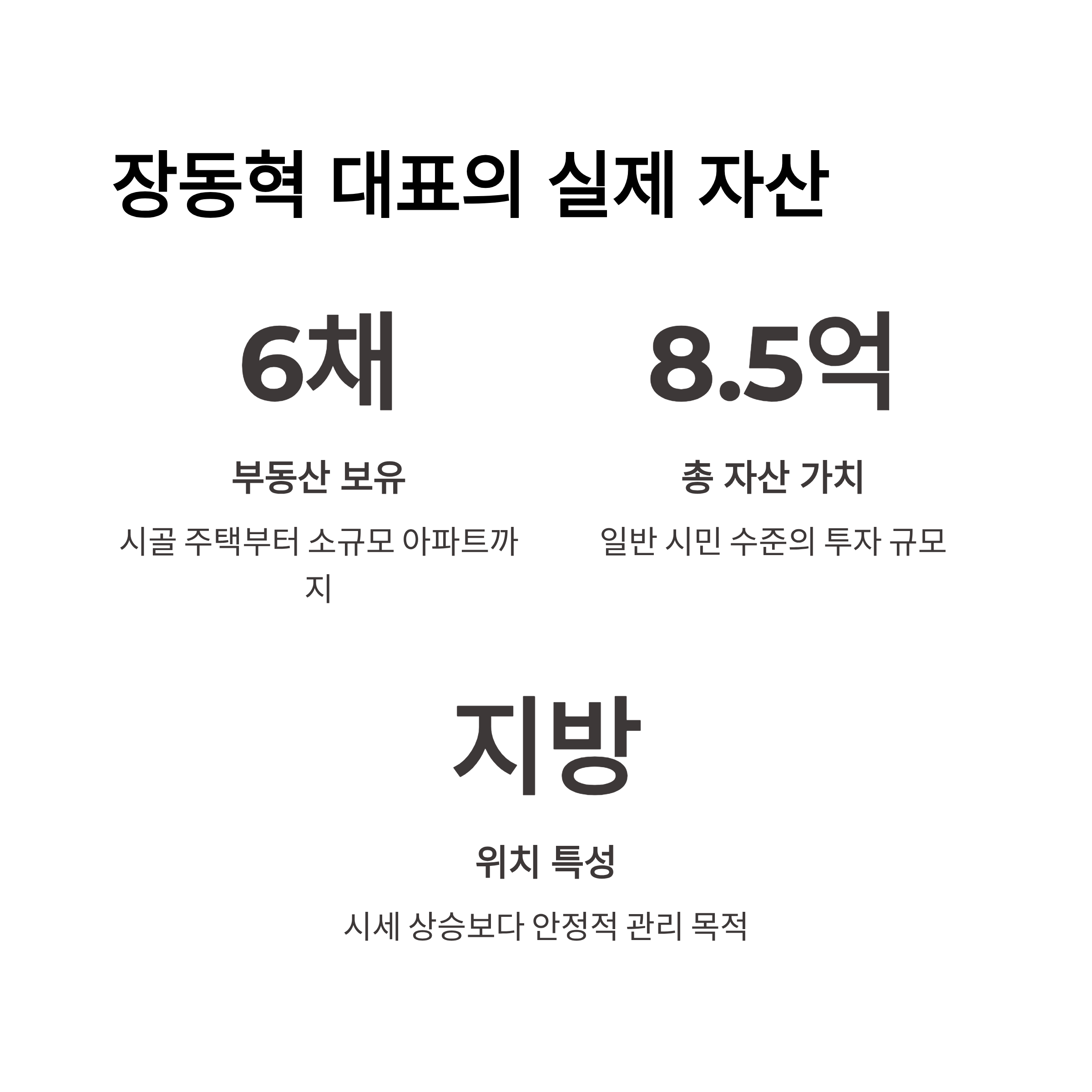 - 장동혁 대표의 부동산 자산 총액은 약 8억 5천만 원으로, 과장된 비판과 사실이 다섭니다.