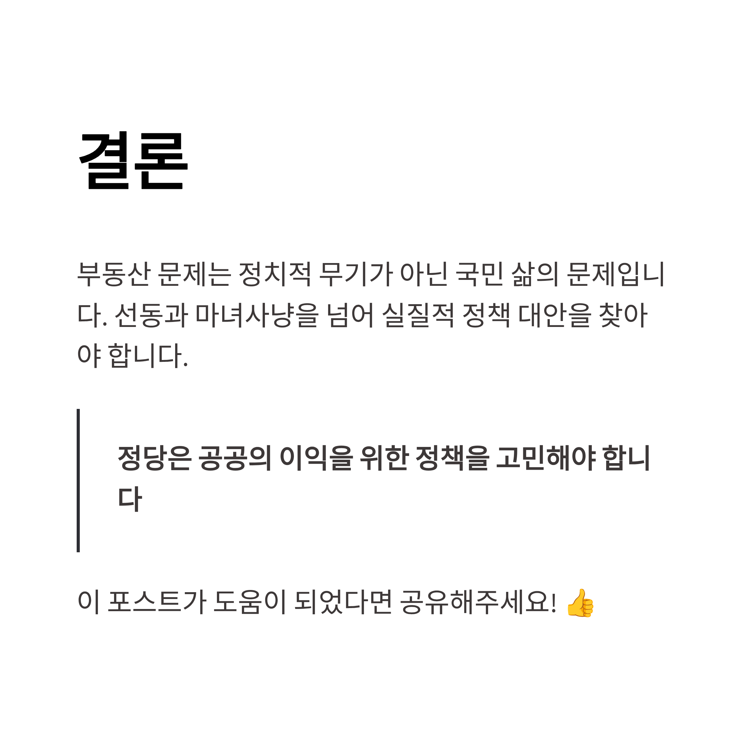 이처럼 부동산 문제는 정당 간의 책임 문제를 넘어 구조적 문제이자 정책적 문제입니다. 정치적 목소리가 분열을 일으키기보다는 해결책을 모색해야 하는 이유가 바로 여기에 있습니다.