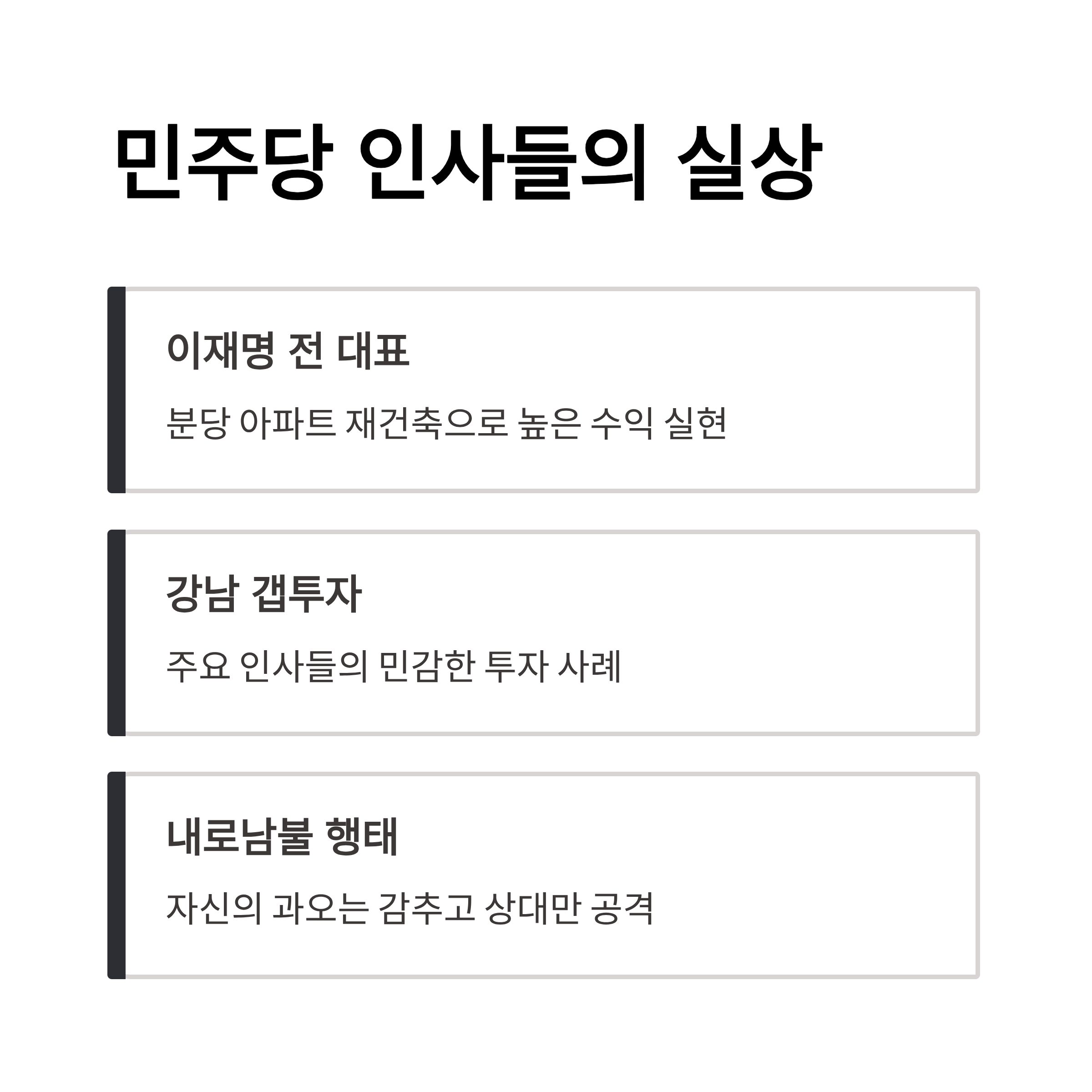 한편 민주당 내 주요 인사들은 본인이 참여한 재건축 프로젝트와 강남 갭투자 논란을 오히려 상대적으로 감추고 있습니다. 이재명 전 대표는 분당 아파트 재건축을 통해 높은 수익을 올린 것으로 알려졌으며, 강남 지역 부동산을 중심으로 한 투자 사례 역시 민감한 문제로 남아 있습니다. 이는 자신들의 과오를 덮기 위해 상대 정당을 공격하는 내로남불 행태로 비판받고 있습니다.