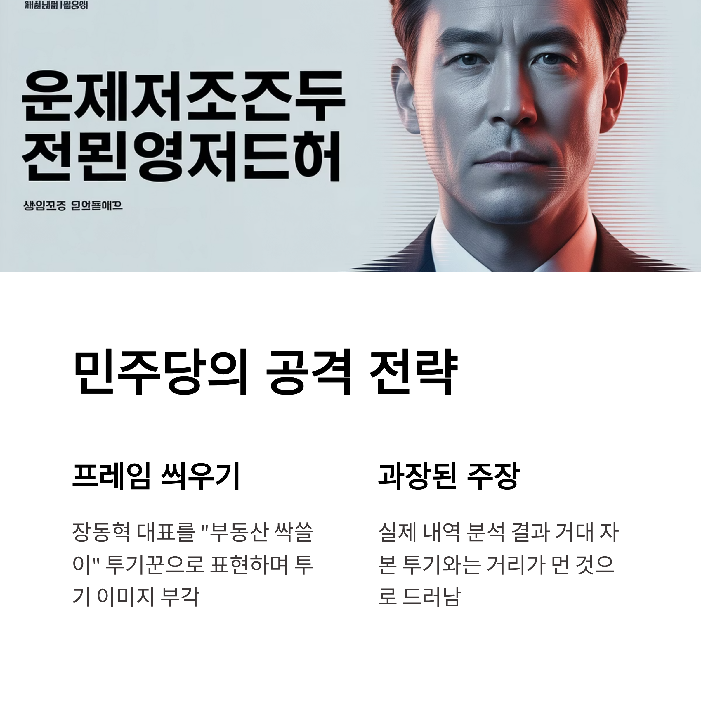 - 민주당은 장동혁 대표를 부동산 투기와 연관지어 대중에게 선동적 메시지를 전달하려는 모습을 보였습니다.