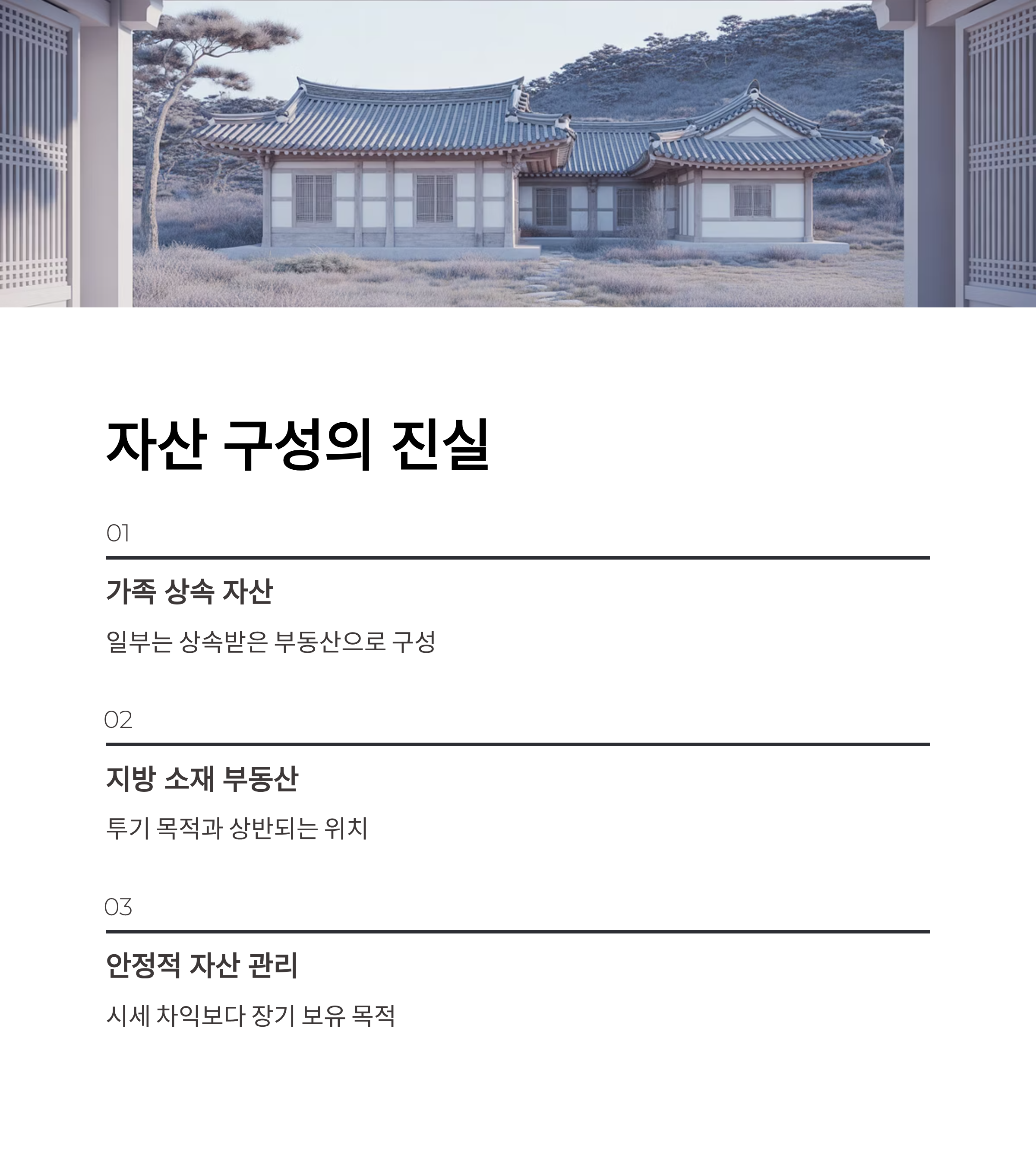 세부 내역을 보면 장동혁 대표 소유 부동산은 여섯 채로 구성되었으며, 그 가치는 총 8억 5천만 원에 불과합니다. 부동산 중 일부는 가족 보유 자산으로 상속받은 것이며, 나머지 자산도 지방에 위치해 시세 상승 가능성보다는 안정적인 자산 관리 목적이 더 뚜렷합니다. 이러한 점은 투기를 목적으로 하는 다주택 보유자의 특징과 상반됩니다.