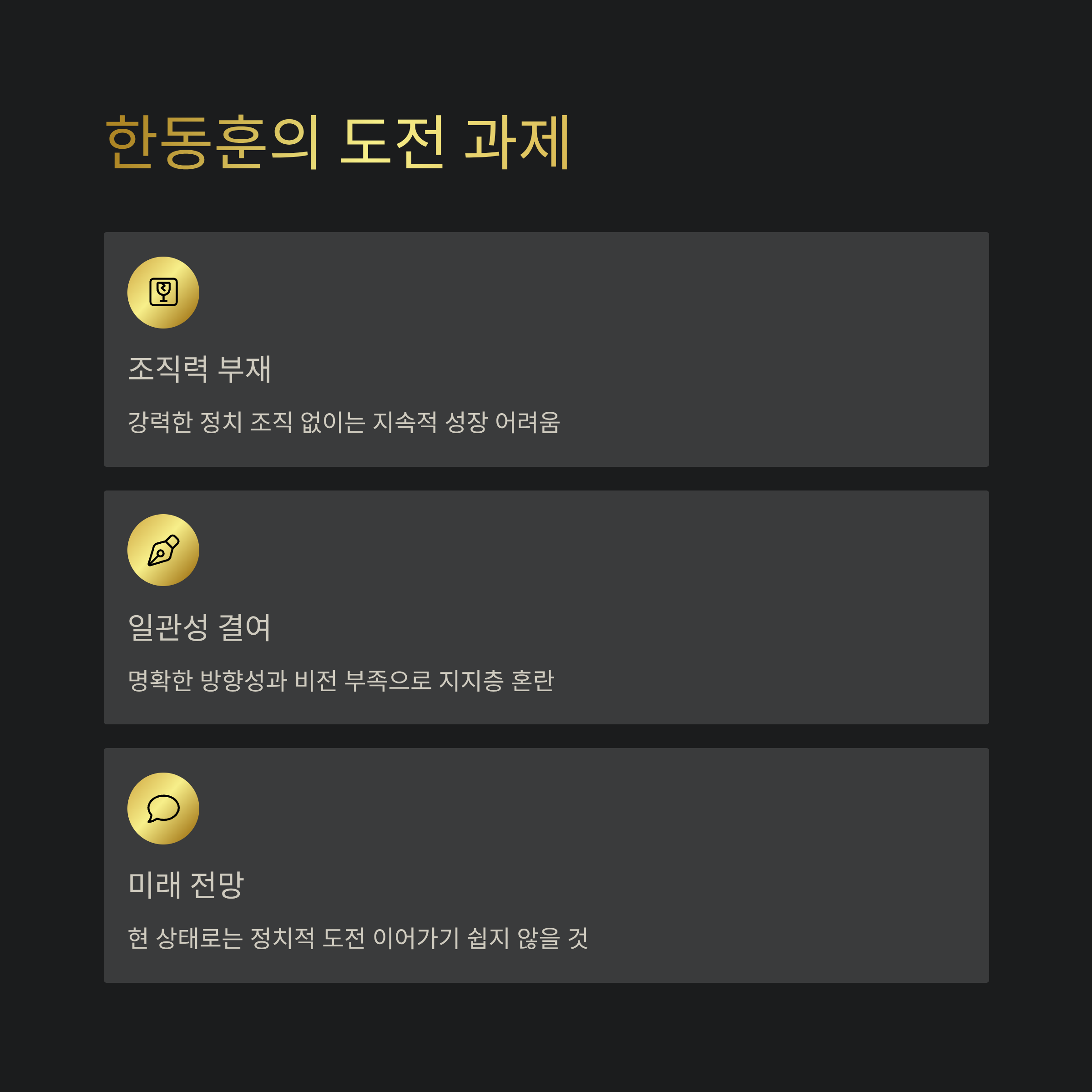 5. 한동훈 대표의 경우 조직력의 부재와 일관성 결여로 인해 정치적 도전을 이어가기가 쉽지 않을 것으로 예측됩니다.
