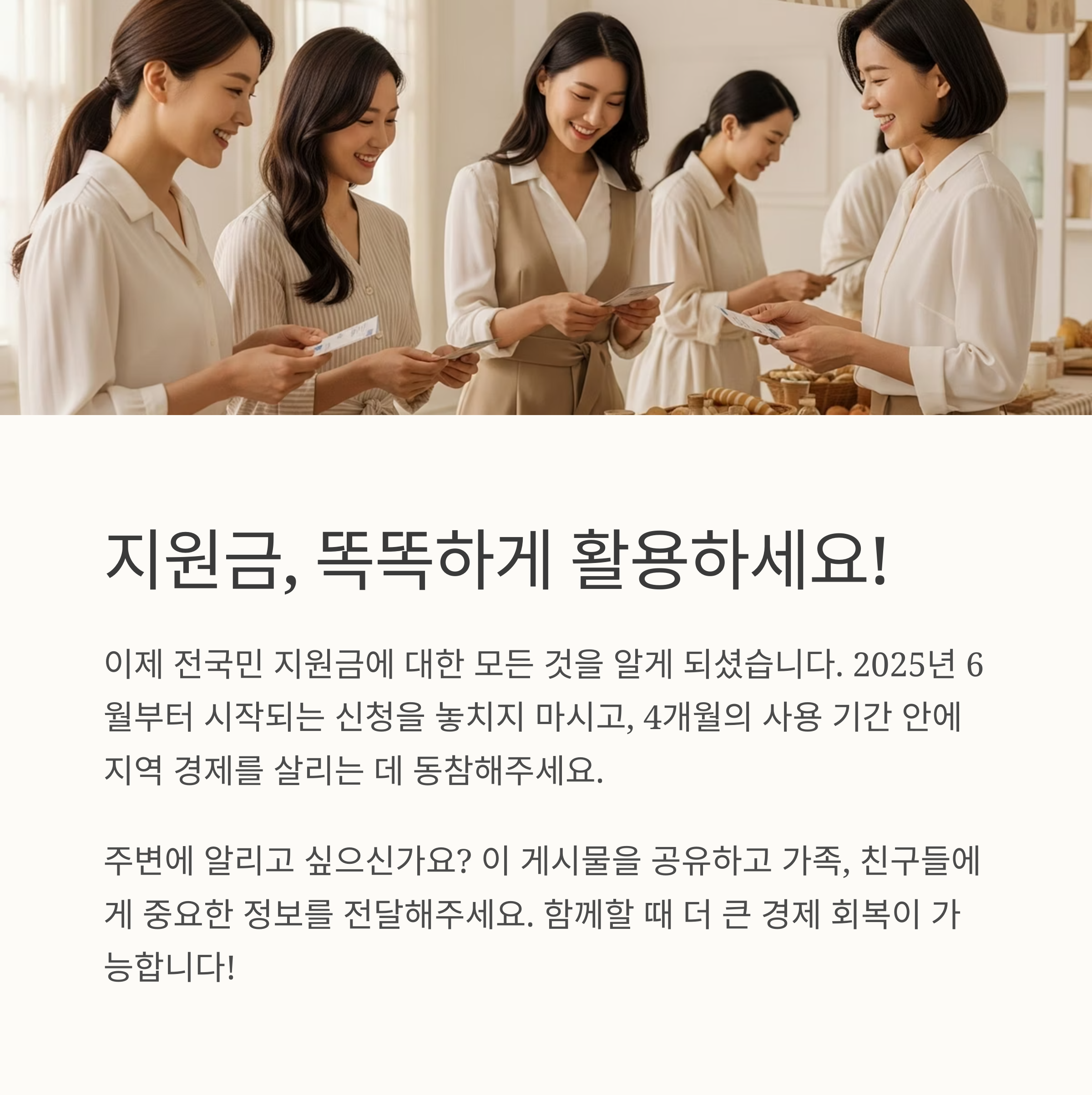 전국민 지원금은 단순한 현금 지원을 넘어, 국민 경제를 회복시키고 사회적 연대를 강화하기 위한 포괄적 정책입니다. 특히 차등 지급과 소비 쿠폰 형태는 형평성과 실효성을 함께 추구하는 정부의 의도를 보여줍니다. 하지만 일부 제도적 한계—예를 들어 온라인 사용 제한, 짧은 유효 기간 등—은 향후 보완이 필요합니다.