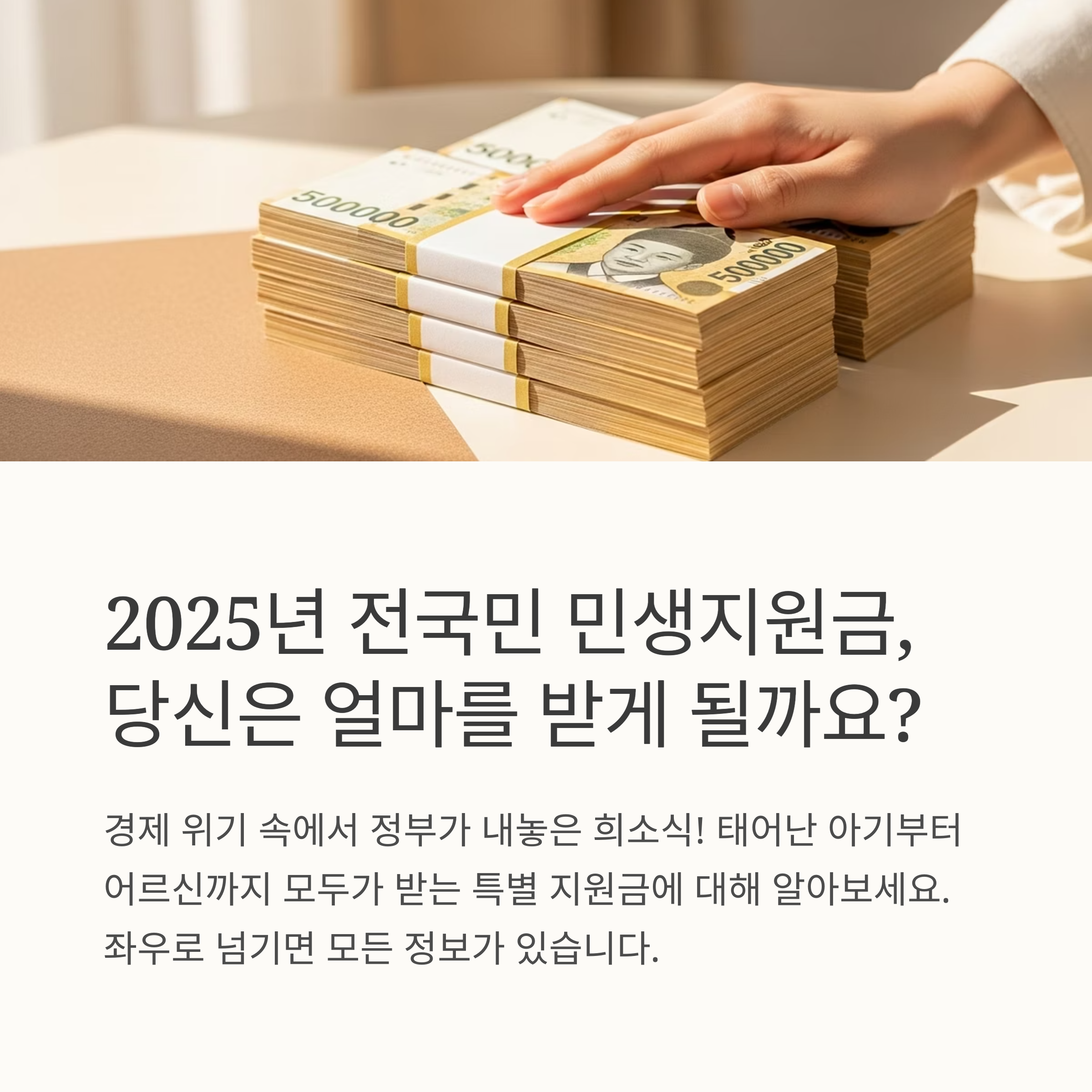 대한민국 정부가 전 국민을 대상으로 새로운 지원금을 지급한다는 소식이 알려지면서 많은 이들의 관심이 쏠리고 있습니다. 특히 물가 상승과 경기 침체가 이어지는 가운데, 이번 지원금은 단순한 일회성 혜택이 아닌 서민 경제를 살리기 위한 중요한 정책으로 받아들여지고 있습니다. 갓 태어난 아기부터 은퇴한 어르신까지 누구나 수혜 대상이 될 수 있다는 점에서 국민적 관심이 집중되고 있는데요. 본 글에서는 전국민 지원금의 목적, 금액, 신청 방법, 사용처까지 핵심 정보를 쉽게 풀어드리겠습니다. 특히 "정말 모두 받을 수 있는 건가요?" 같은 궁금증에 대해 정확하고 현실적인 답을 제시해 드립니다. 지급 시기와 유효 기간까지 꼼꼼히 안내하니, 마지막까지 꼭 읽어보세요!