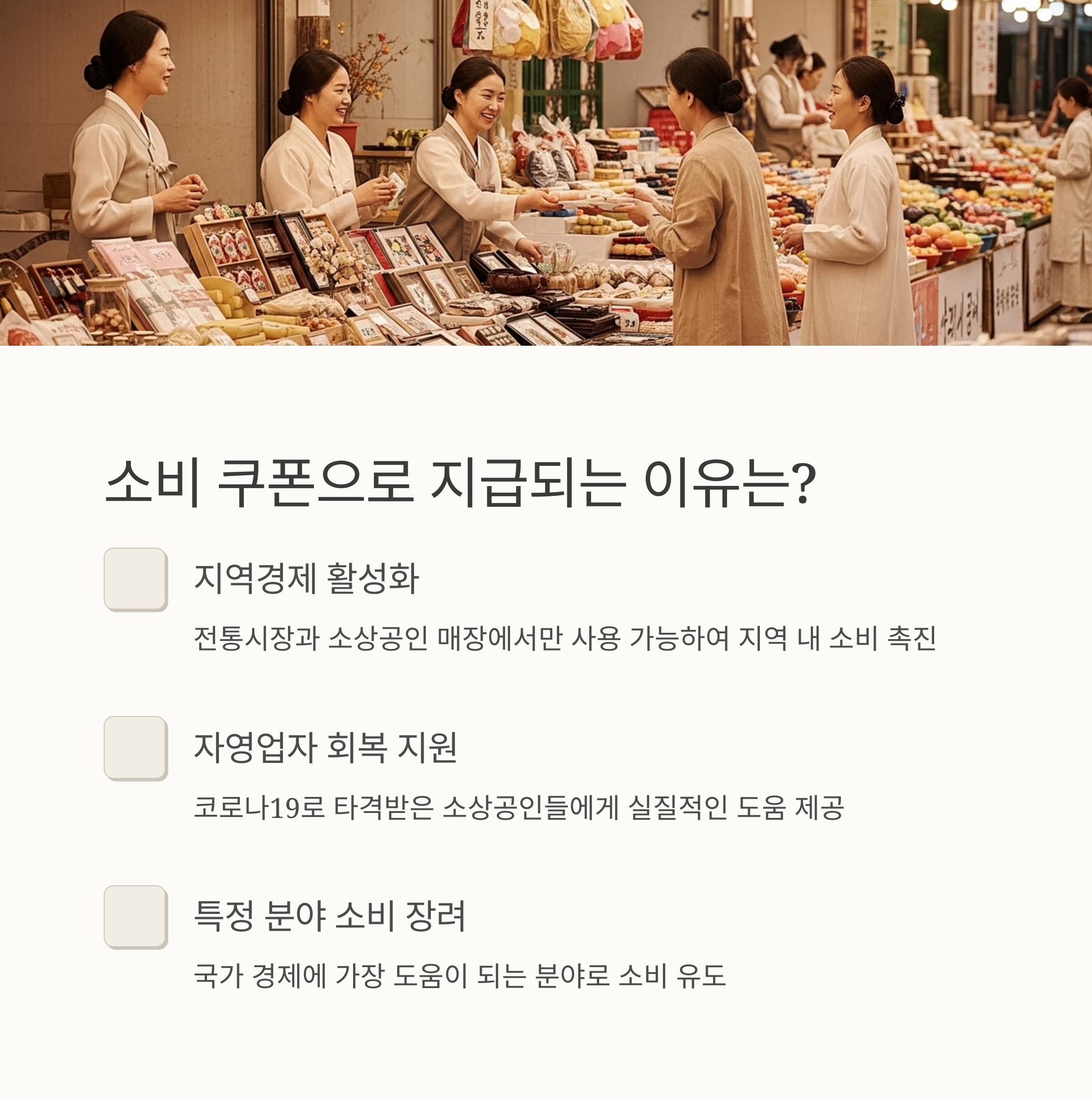 이번 전국민 지원금은 현금이 아닌 소비 쿠폰으로 지급됩니다. 소비 쿠폰은 지역경제 활성화를 목적으로 도입된 방식으로, 소비자들은 전통시장, 소상공인 매장 등에서만 사용할 수 있습니다. 이러한 방식은 지역 내 소비를 유도하여 자영업자 회복에 도움을 주려는 의도가 강합니다.