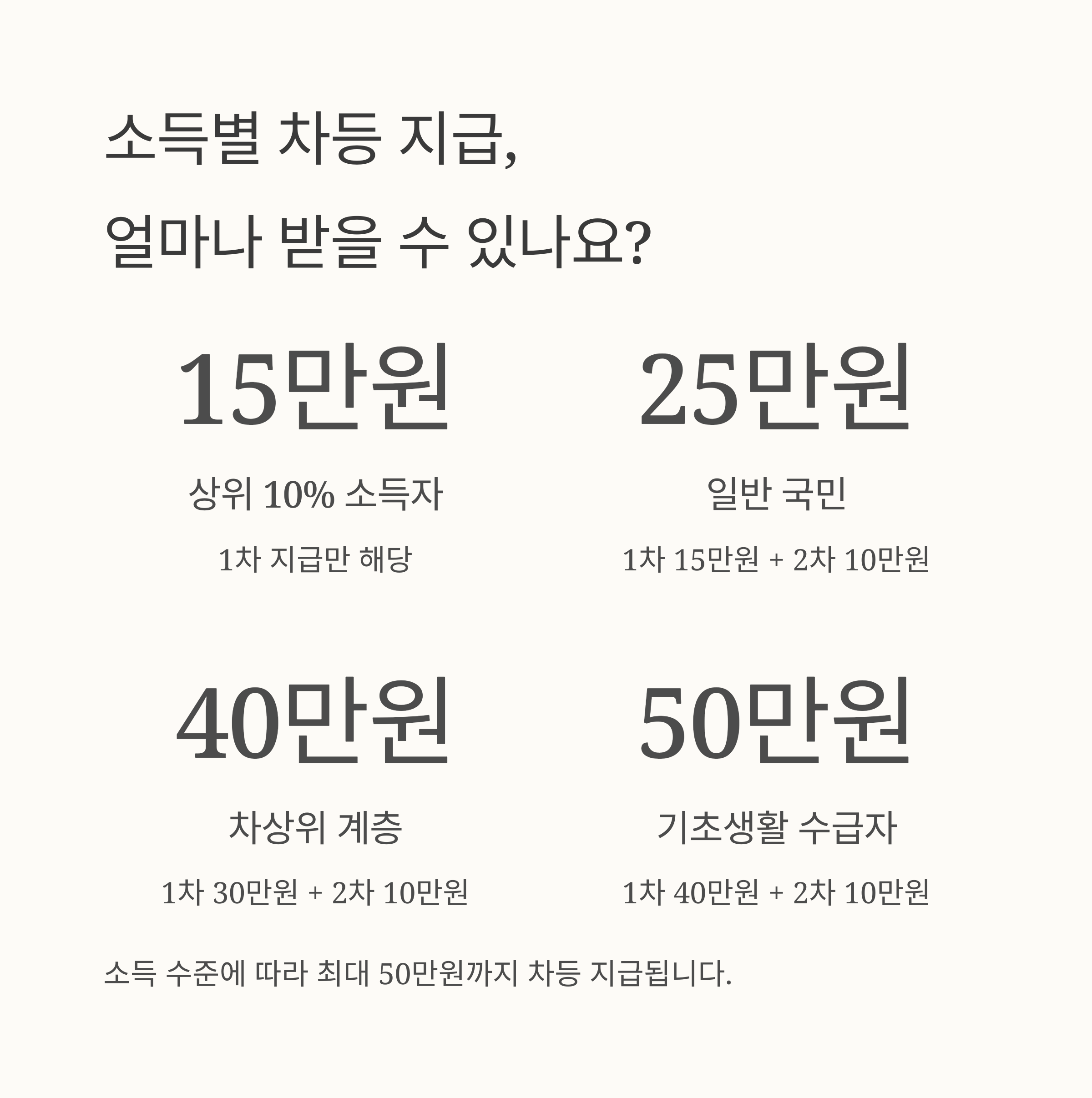 이번 지원금은 전 국민에게 일정 금액을 일괄 지급하는 것이 아니라, 소득 수준에 따라 차등 지급됩니다. 일반 국민은 1차 15만 원 + 2차 10만 원으로 총 25만 원을 받으며, 차상위 계층은 총 40만 원, 기초수급자는 50만 원을 수령하게 됩니다.