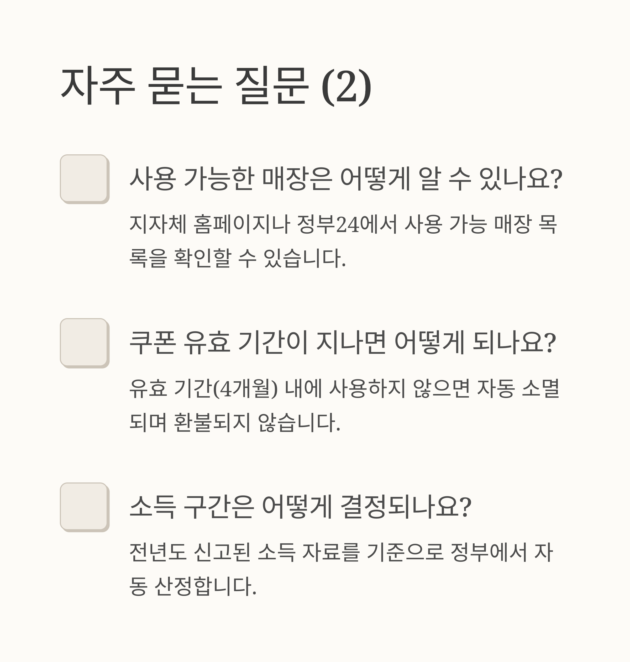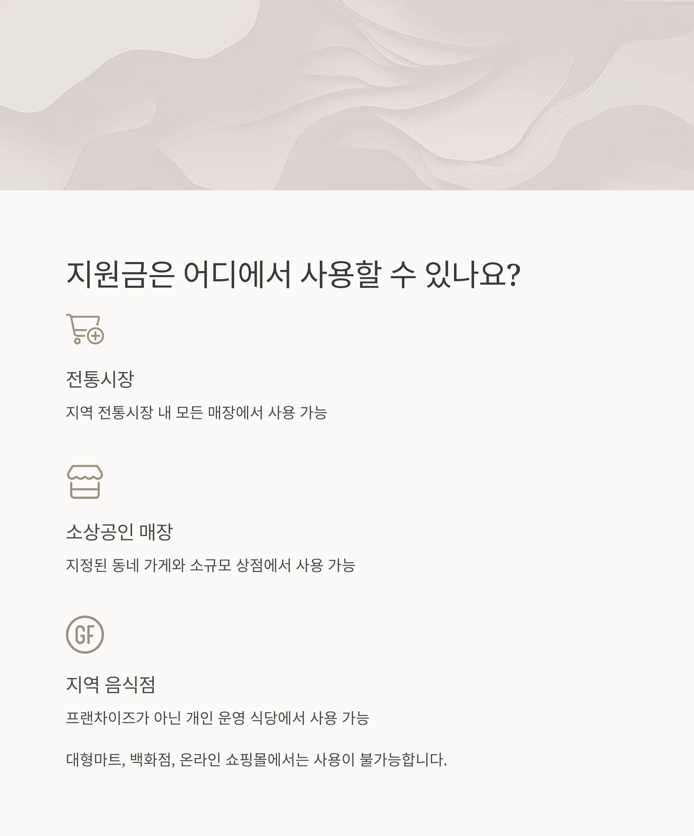 A3. 각 지역 지자체 홈페이지나 정부24 홈페이지에서 사용 가능 매장 목록을 확인할 수 있습니다.