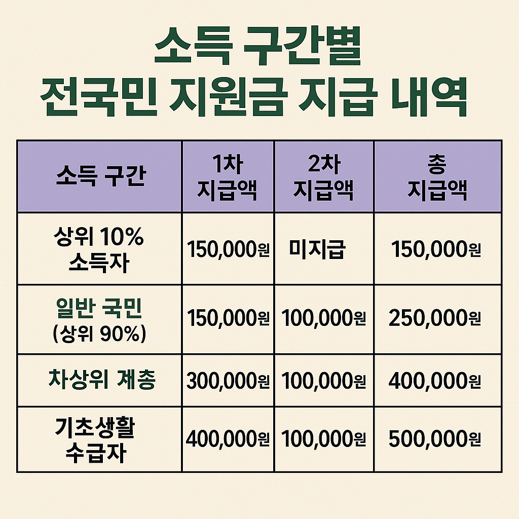 | 소득 구간 | 1차 지급액 | 2차 지급액 | 총 지급액 |