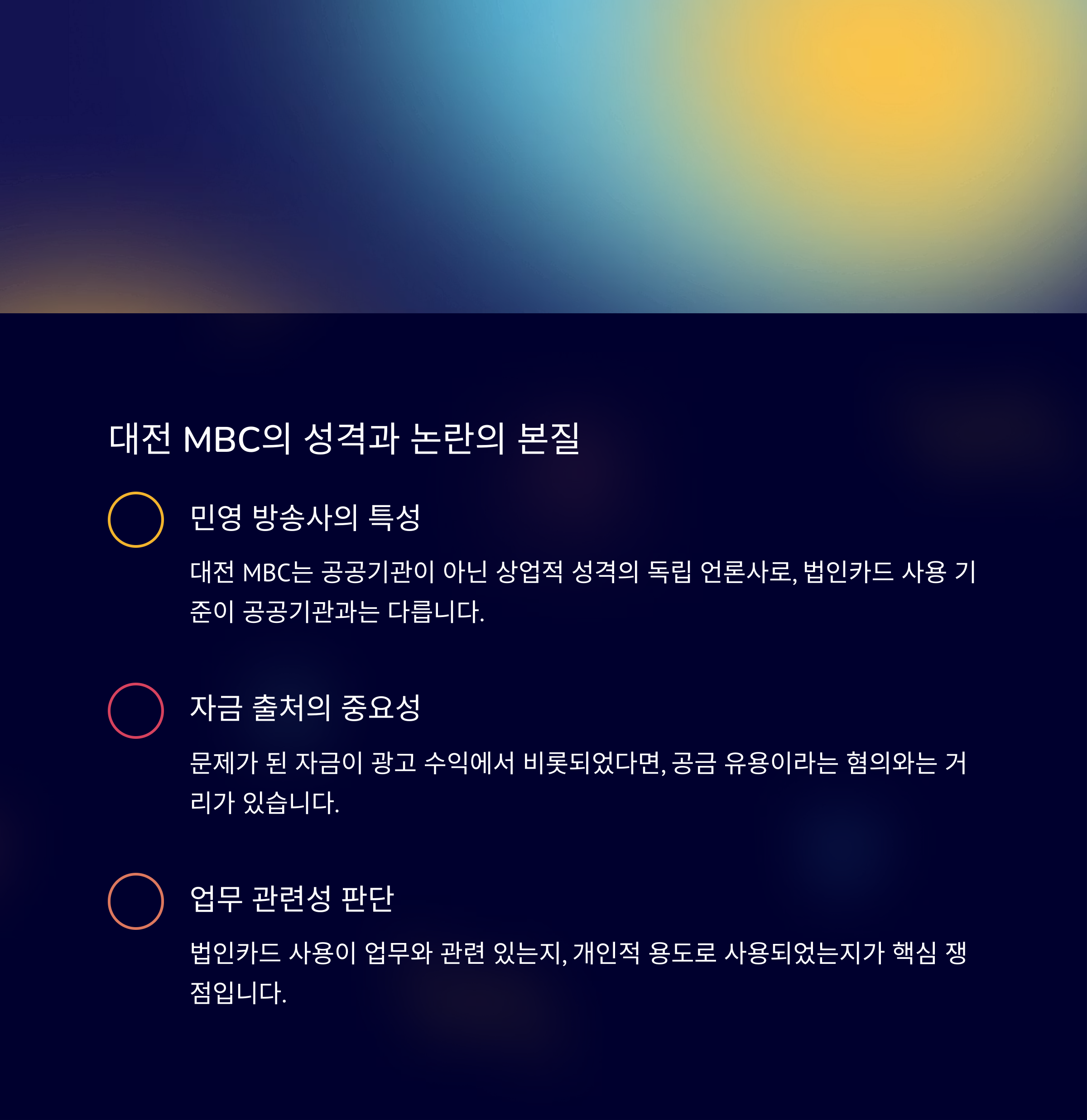 법인카드 사용 문제는 정치적 색깔보다도 기업 및 기관의 내부 규정과 국가 자금 사용 여부가 핵심 쟁점입니다. 대전 MBC는 공공기관이 아니라 상업적 성격의 독립된 언론사였다는 점에서, 이번 사건에서 자금 사용의 적법성을 따지는 것이 중요한 순간입니다. 정치적 소환 의혹보다도 사건의 본질인 재정 투명성, 업무상 사용 여부를 명확히 판단하는 것이 필요합니다.