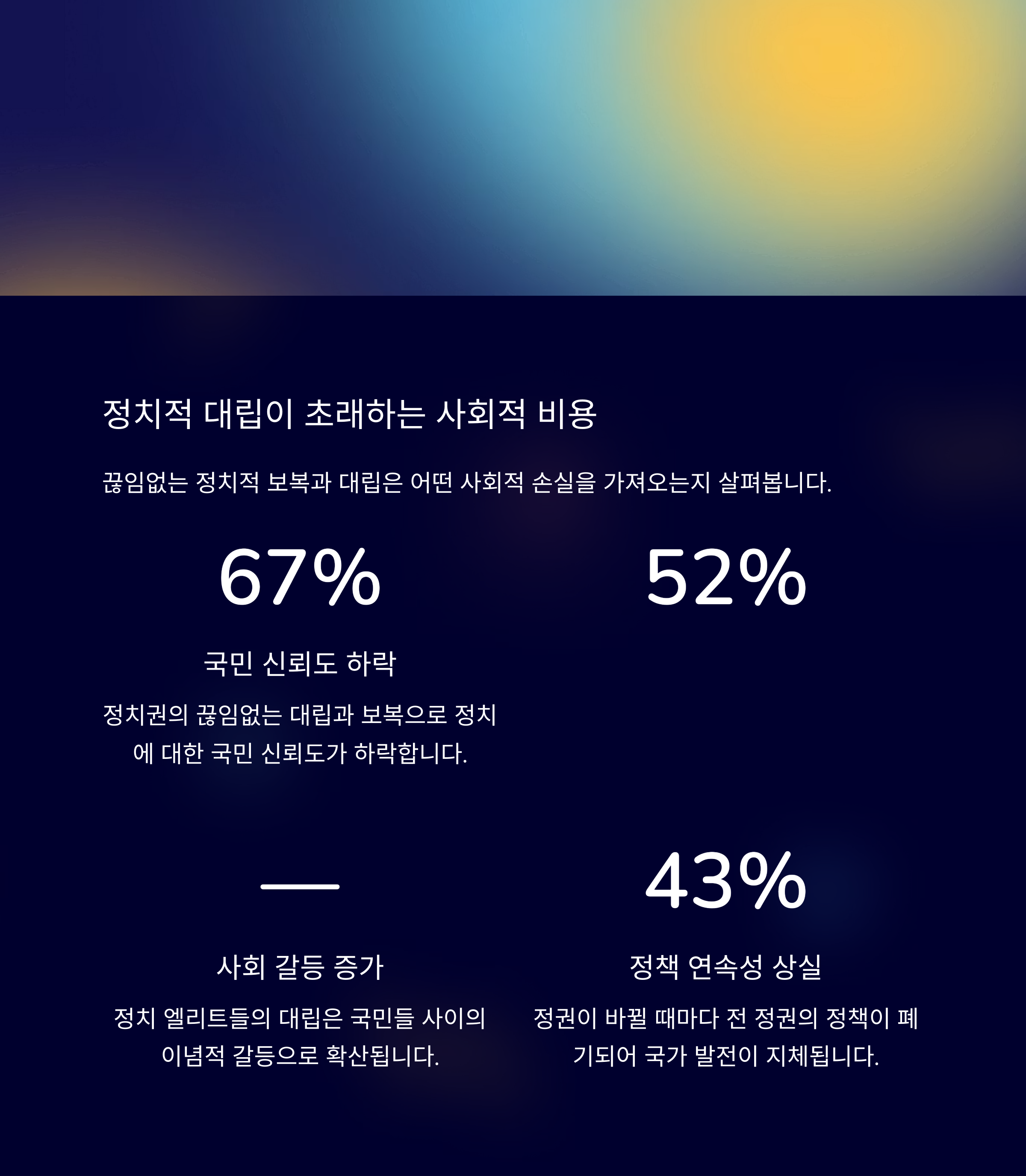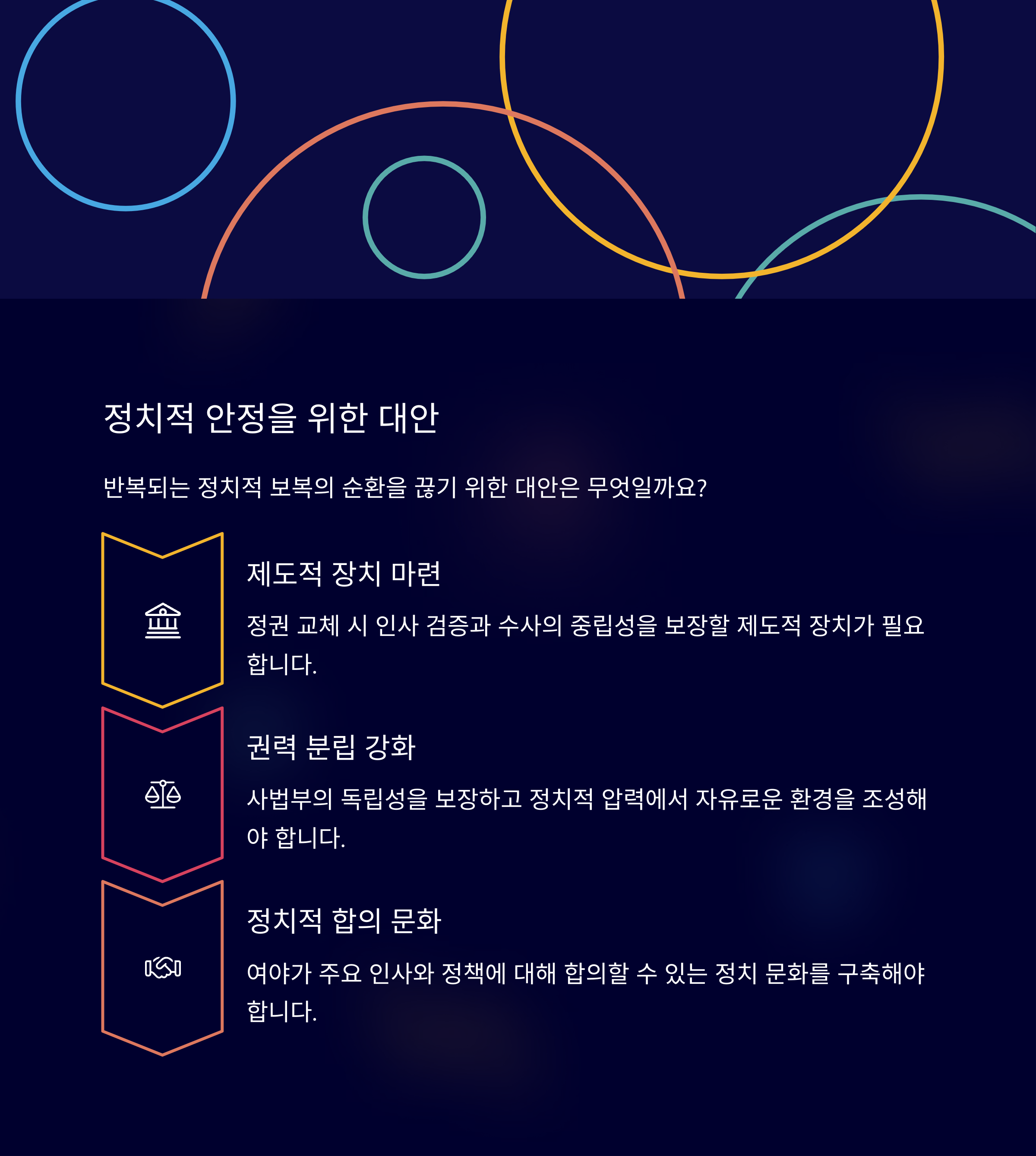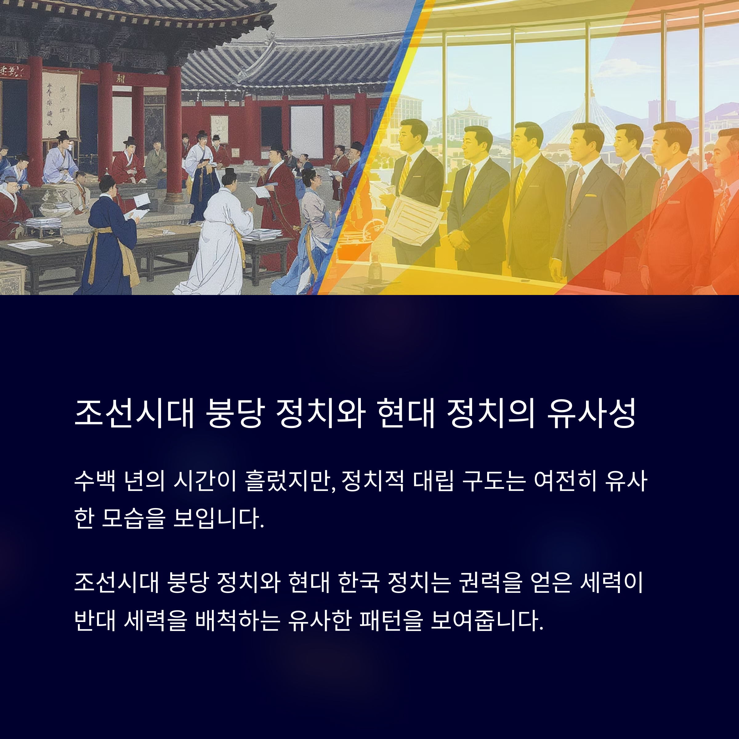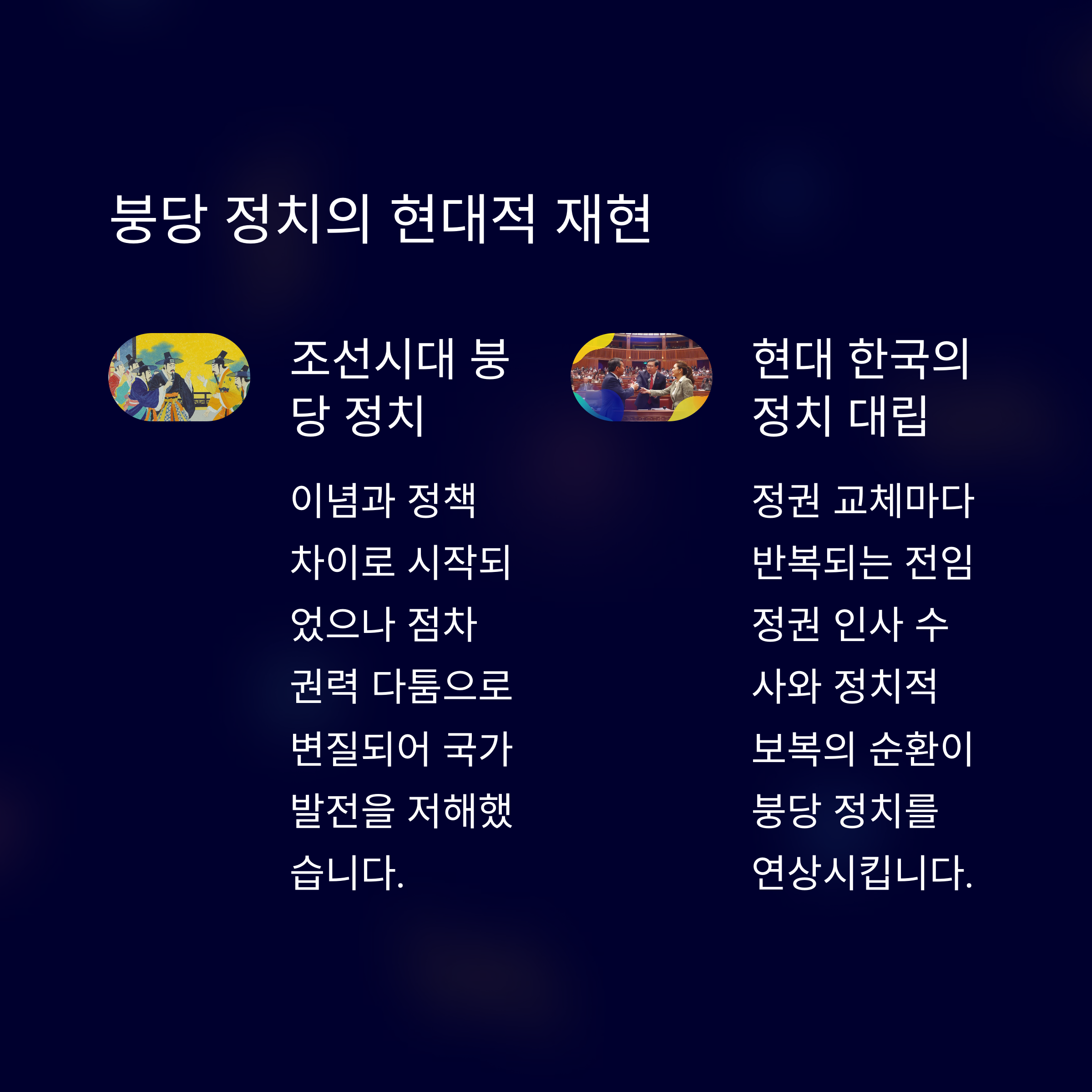과거 조선시대 붕당 정치는 서로 다른 이념과 정책을 가진 세력 간의 극단적인 대립으로 이어졌습니다. 현재 한국 정치 역시 정권이 교체될 때마다 전 정권의 주요 인사들에 대한 사법적 접근이 반복되며, 이 같은 붕당적 구조가 현대적으로 재현되고 있다고 볼 수 있습니다. 대립의 지속은 사회적 갈등의 심화와 국민 신뢰 저하를 초래할 위험이 있습니다. 이러한 반복을 막기 위해서는 정치의 공정성과 사회 통합을 우선시하는 새로운 대안이 필요합니다.