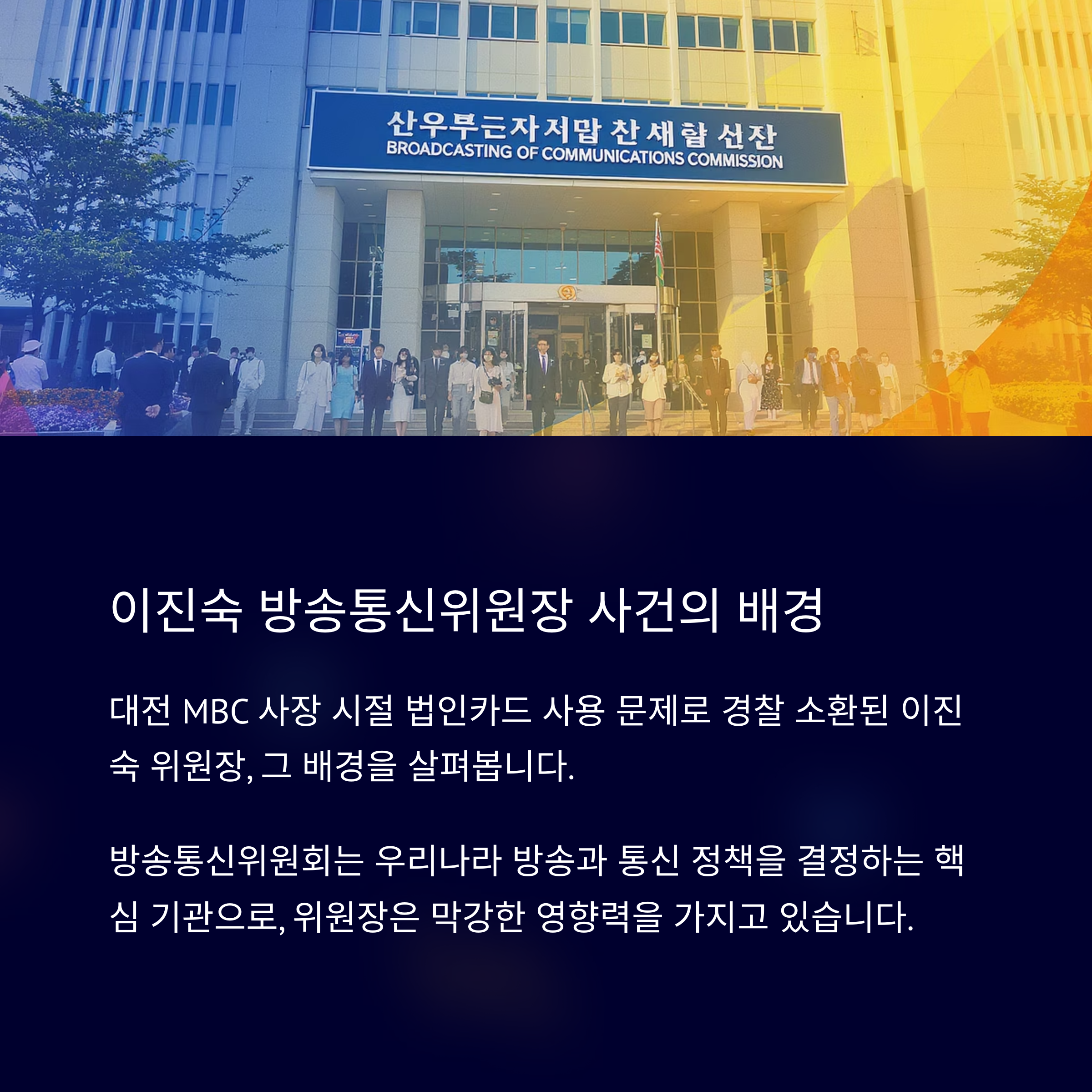 정권 교체 시기에는 흔히 국가 조직 내부에서 전·현직 인사들의 교체가 이루어지곤 합니다. 이러한 과정은 내부 개혁과 정치적 방향성을 반영하지만, 동시에 논란을 야기하기도 합니다. 이진숙 방송통신위원장이 대전 MBC 사장 재직 당시 법인카드 사용 문제로 경찰에 소환된 사건은 그 단적인 예일 것입니다. 정치적인 이해관계와 대립 구도가 얽힌 이번 사건은, 단순히 개인의 잘못 유무를 넘어 사회 전반에 비치는 영향을 분석할 필요가 있습니다.
