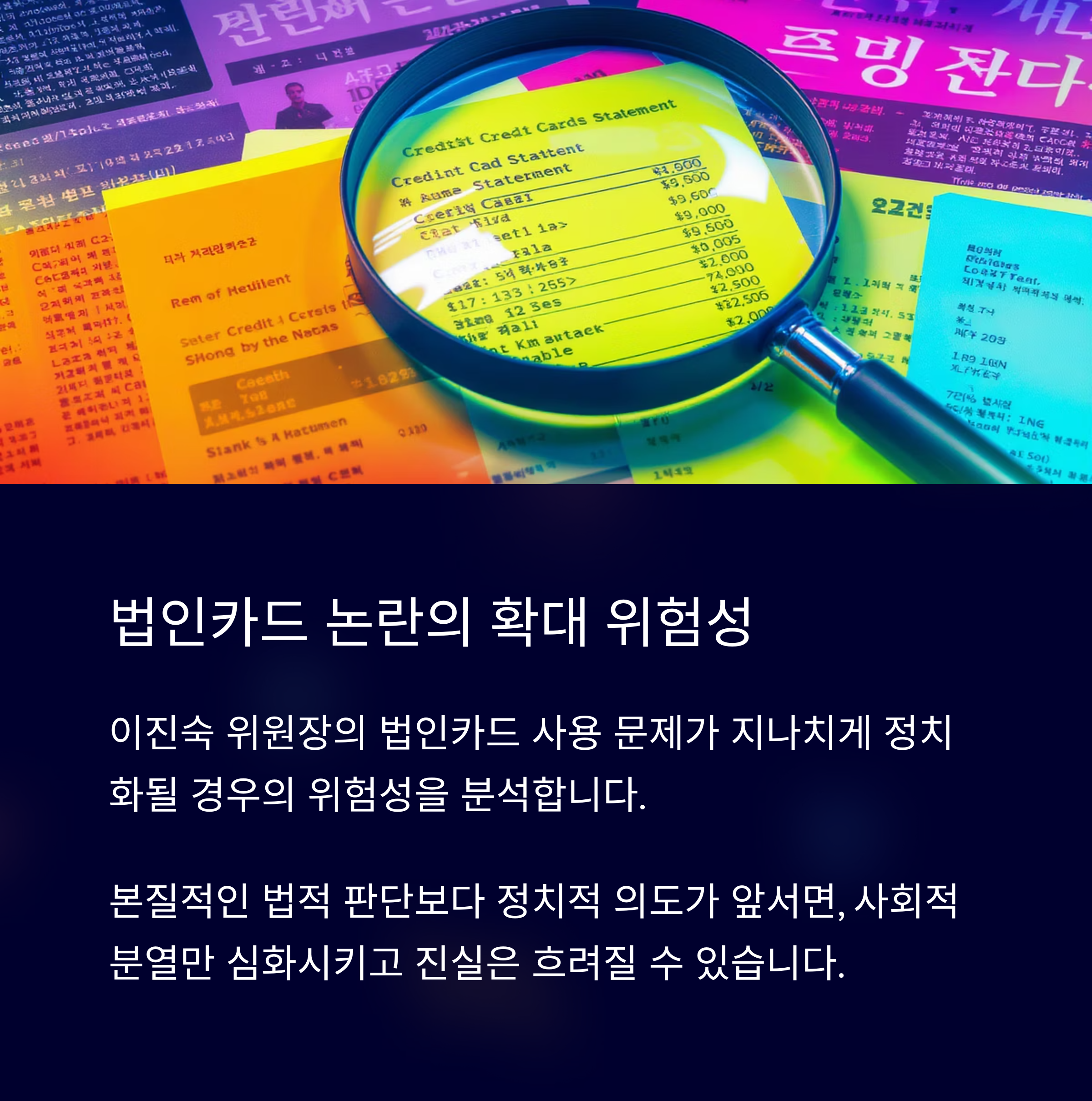 법인카드 사용 논란이 지나치게 확대되어 본질을 흐릴 우려가 있으며, 이는 국민 통합 대신 분열로 이어질 가능성이 있습니다.
