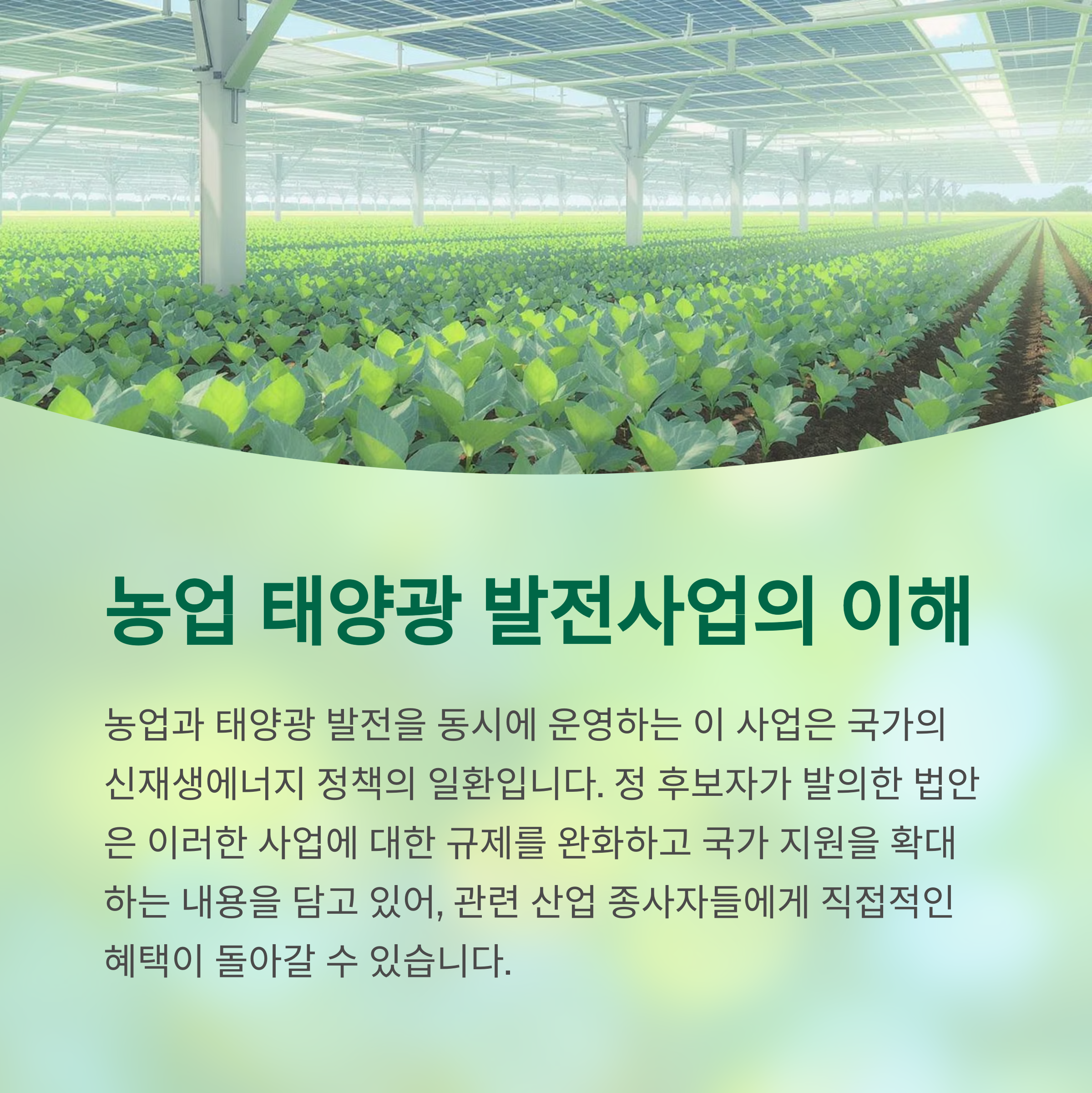 1. 정동영 후보자는 농업 태양광 발전 사업을 활성화하는 관련 법안을 발의하였으며, 이는 규제 완화와 정부 지원 확대를 주요 골자로 하고 있습니다.