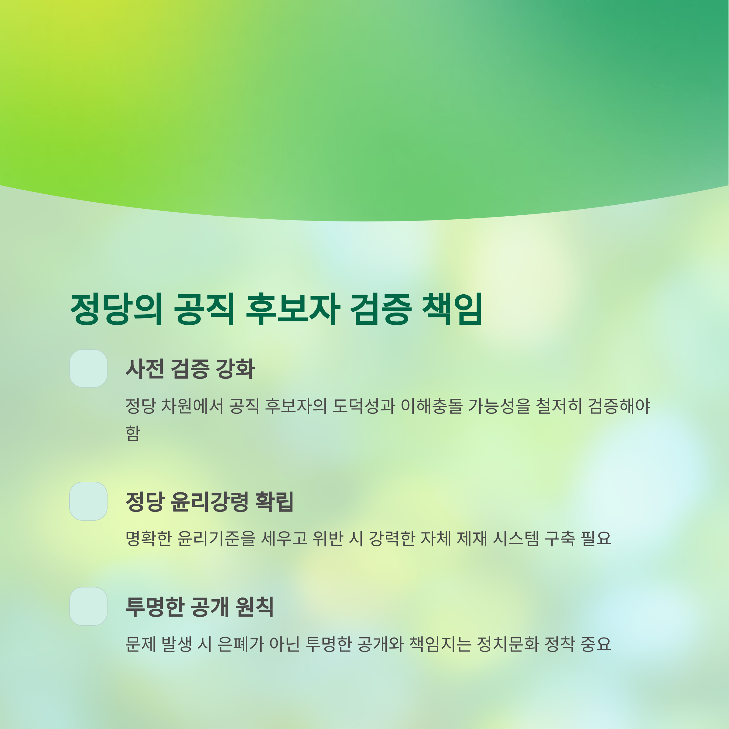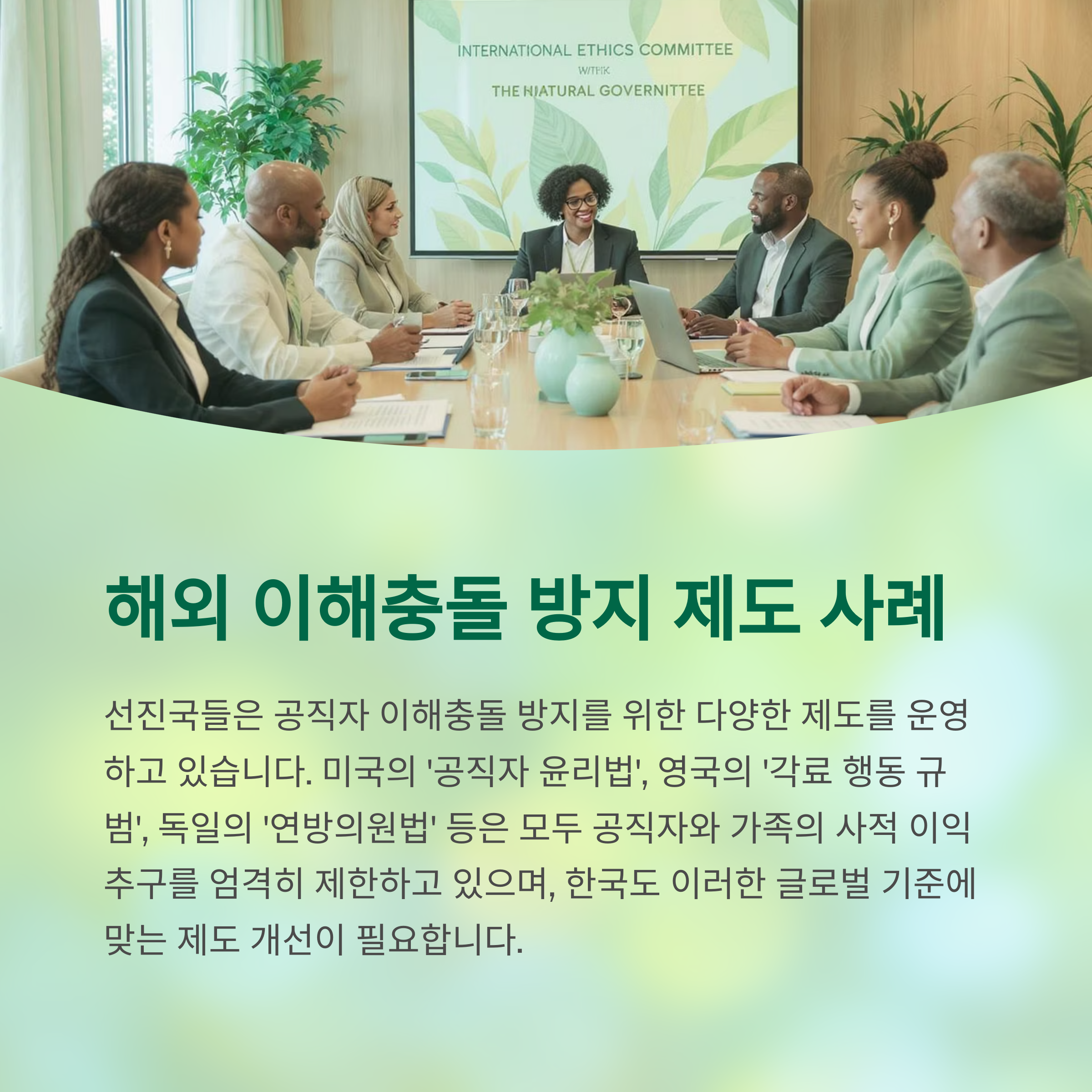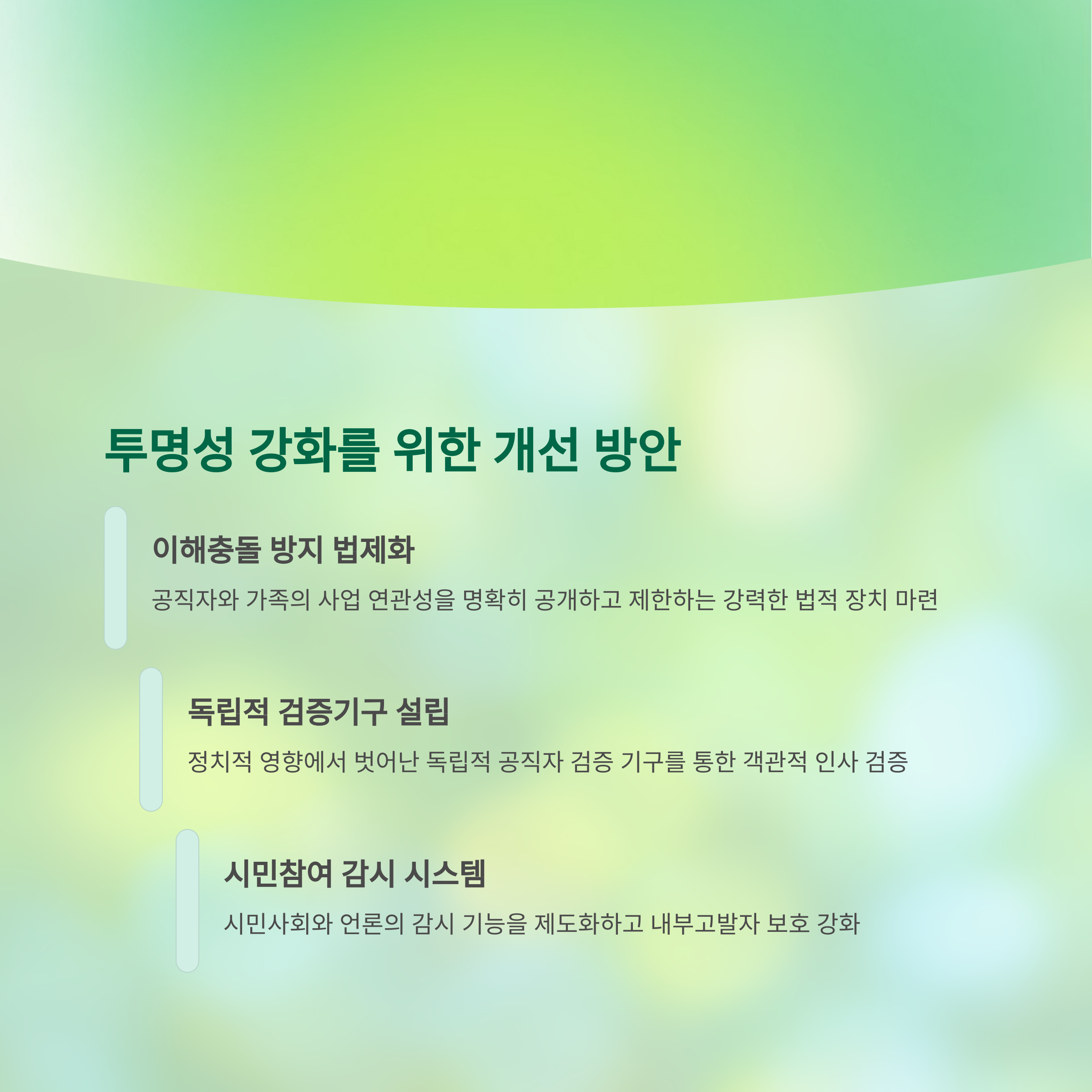 | A. 철저한 공직자 검증 시스템 도입, 법안 발의 투명성 강화, 이해 충돌 방지 장치 마련 등이 필요합니다. 또한 시민사회와 언론의 역할을 강화하는 제도적 장치도 중요합니다. |