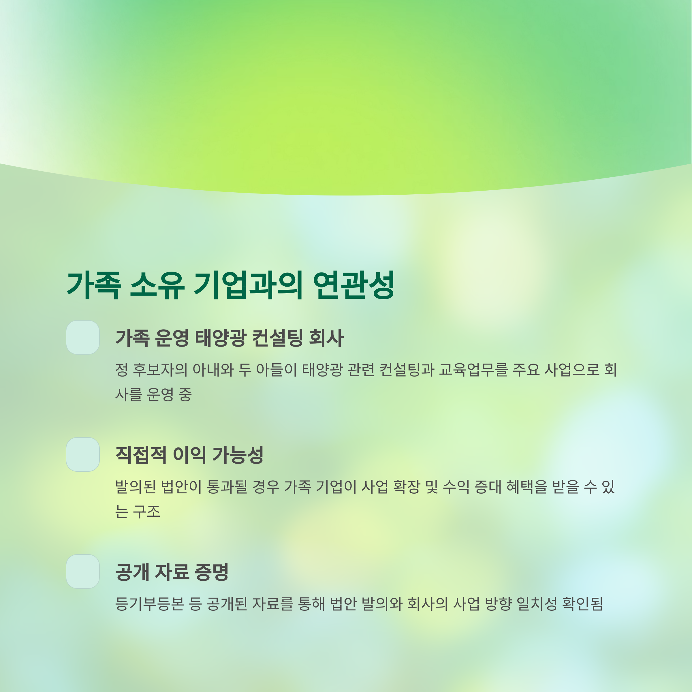 2. 정 후보자의 가족이 소유한 태양광 컨설팅 회사가 해당 법안으로 직접적인 혜택을 받을 가능성이 제기되고 있습니다.