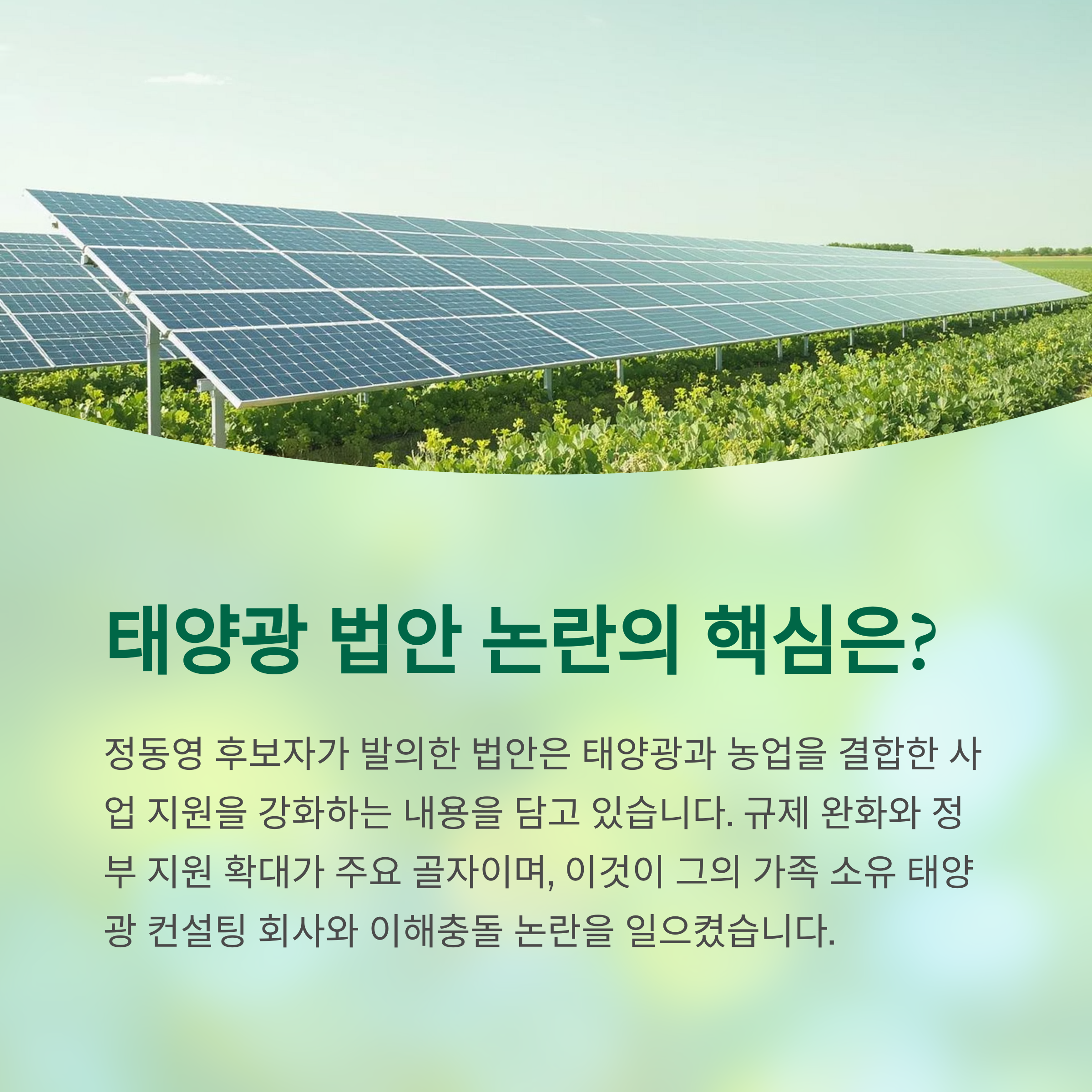 정동영 후보자가 발의한 태양광 관련 법안은 농업과 태양광 발전을 동시에 운영하는 사업에 대한 다양한 규제 완화와 국가 지원을 명시하고 있습니다. 하지만 그의 가족이 운영하는 태양광 컨설팅 회사가 해당 법안으로 이득을 볼 가능성이 있기에 이해 충돌 논란이 불거졌습니다. 이는 공직자 법안 발의의 공정성과 투명성에 대한 문제를 제기하며 국민의 신뢰를 흔드는 중요한 요인으로 작용하고 있습니다.