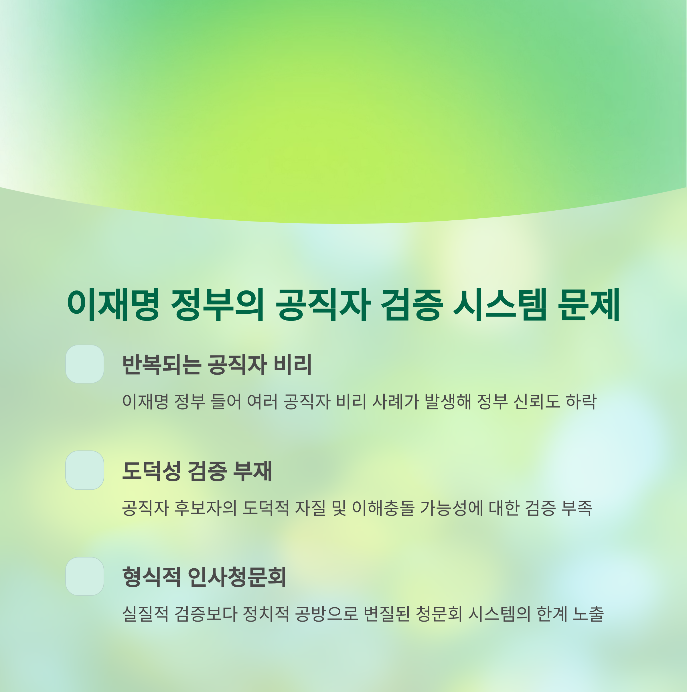 | Q. 이재명 정부의 공직 검증 시스템에 어떤 문제가 있나요? |