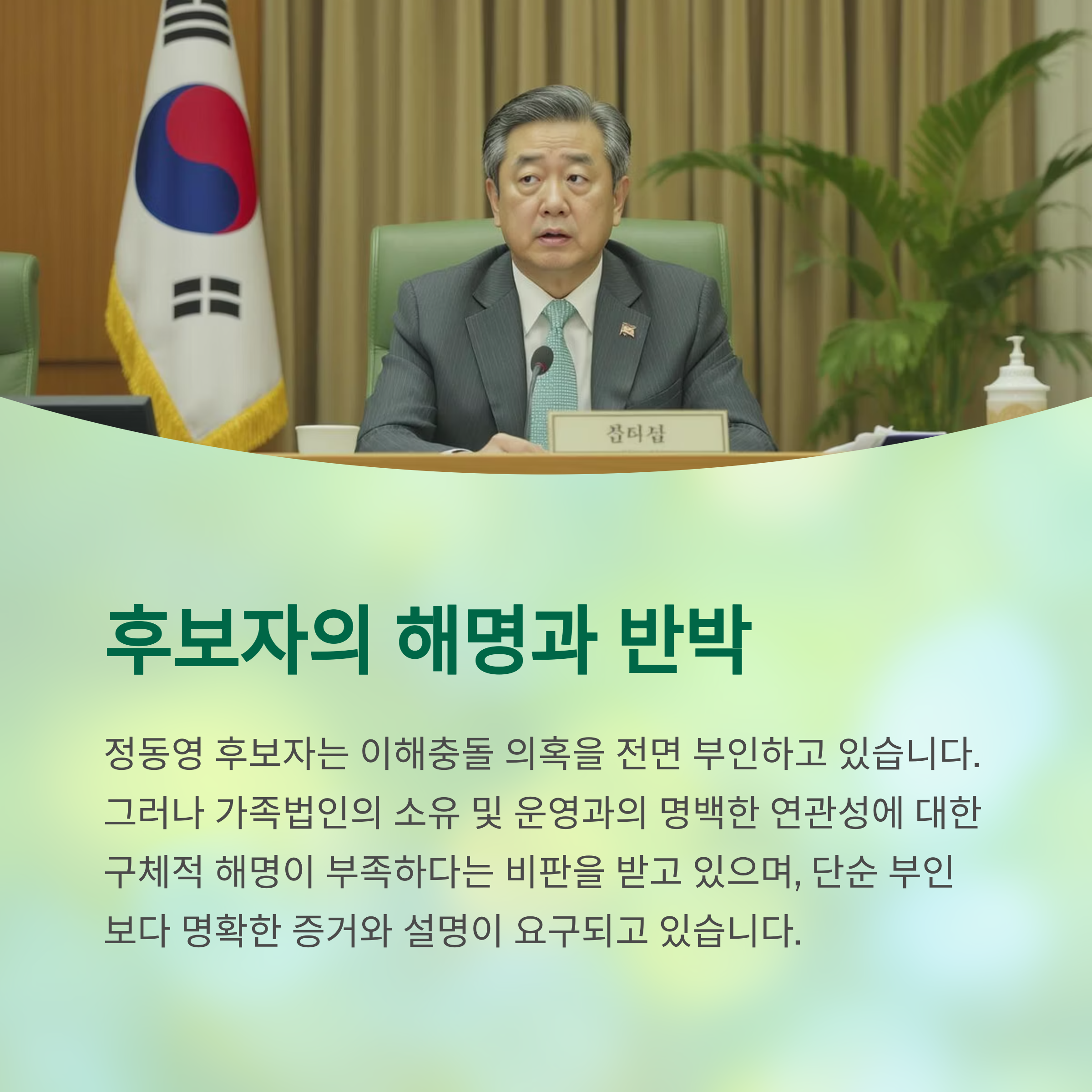 4. 정 후보자는 이해 충돌 의혹을 부인하고 있지만, 가족법인의 소유 및 운영과의 명백한 연관성 해명을 요구받고 있습니다.