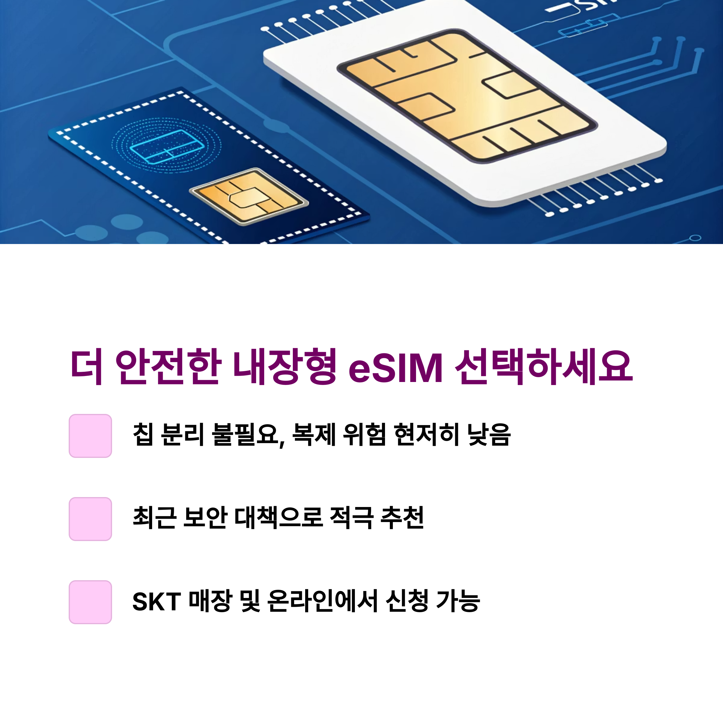더 안전하게 하려면, 내장형 유심(eSIM)으로 바꾸는 것도 좋은 방법입니다. 칩이 따로 없어 복제 위험이 훨씬 낮아요.