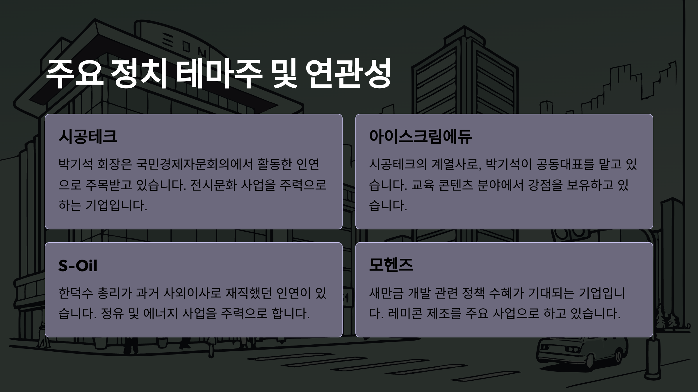 이 글에서는 한덕수 총리와 직접적 또는 간접적으로 관련이 있다고 알려진 주요 기업들을 정리해 소개합니다. 정치 테마주에 관심 있는 투자자나 관련 이슈를 모니터링하는 분들에게 유익한 정보가 될 수 있습니다.