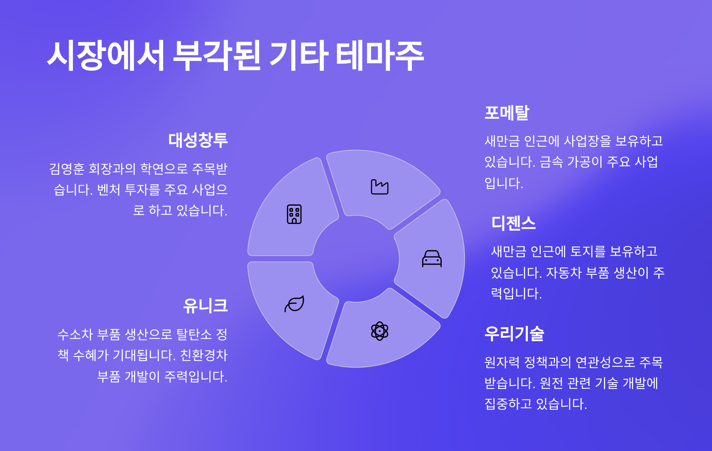 | 디젠스 | 새만금 인근 토지 보유 | 자동차 부품 |