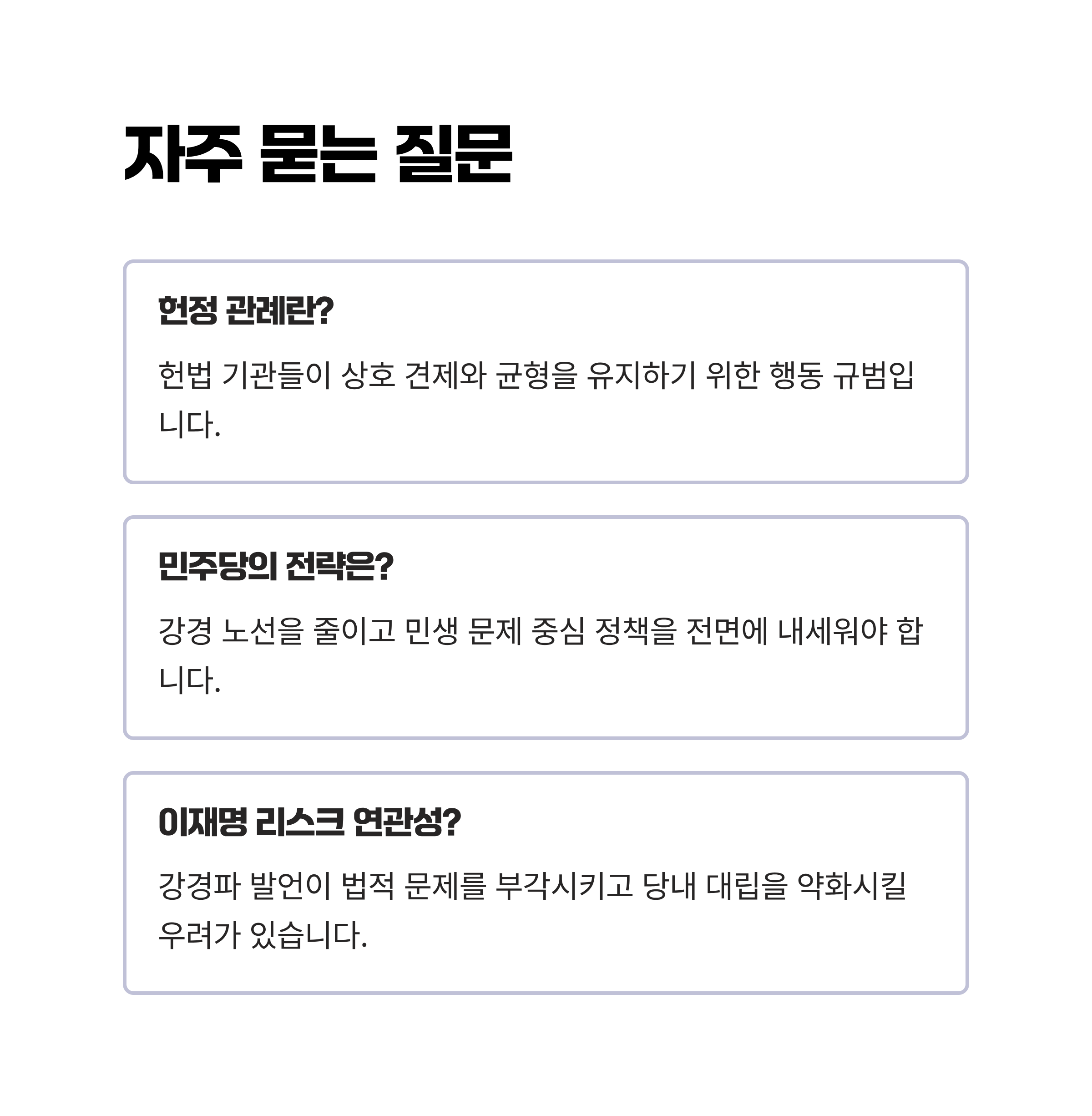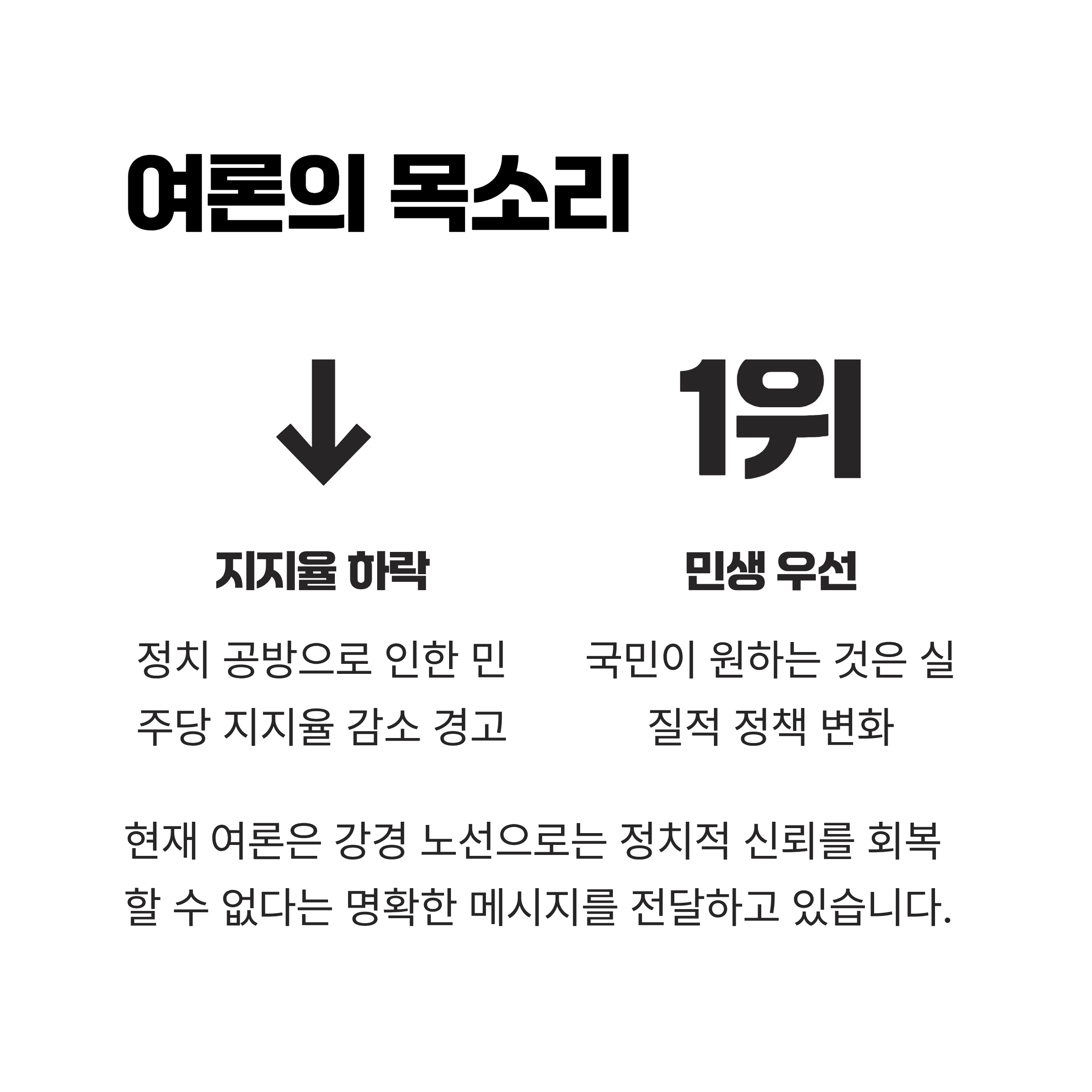 - 여론은 정치적 공방보다 민생 우선의 필요성을 강조하며 민주당 지지율 하락을 경고하고 있습니다.