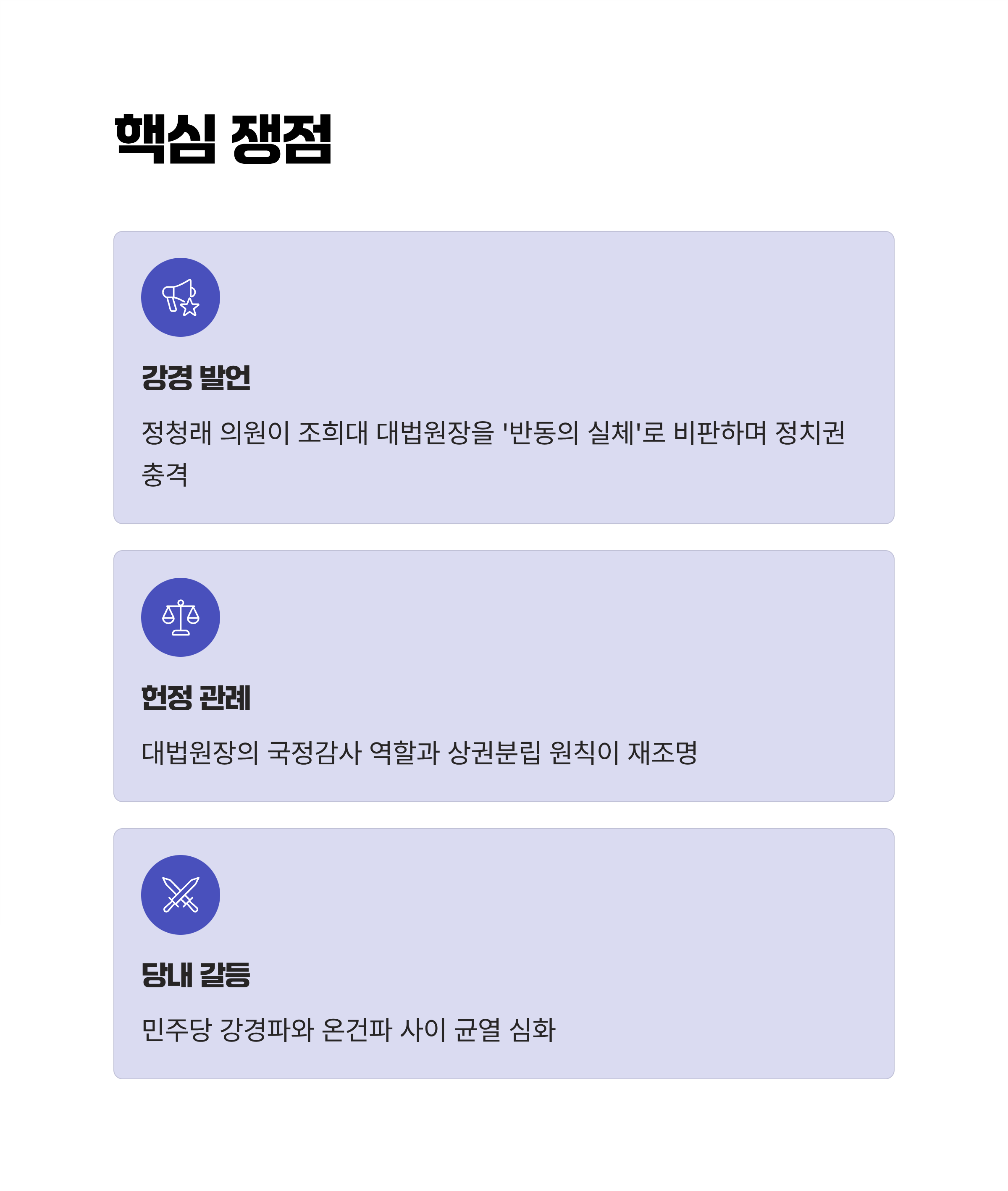 - 정청래는 조희대 대법원장을 개혁 저항의 상징으로 비판하며 궤도 이탈 논란을 유발했습니다.