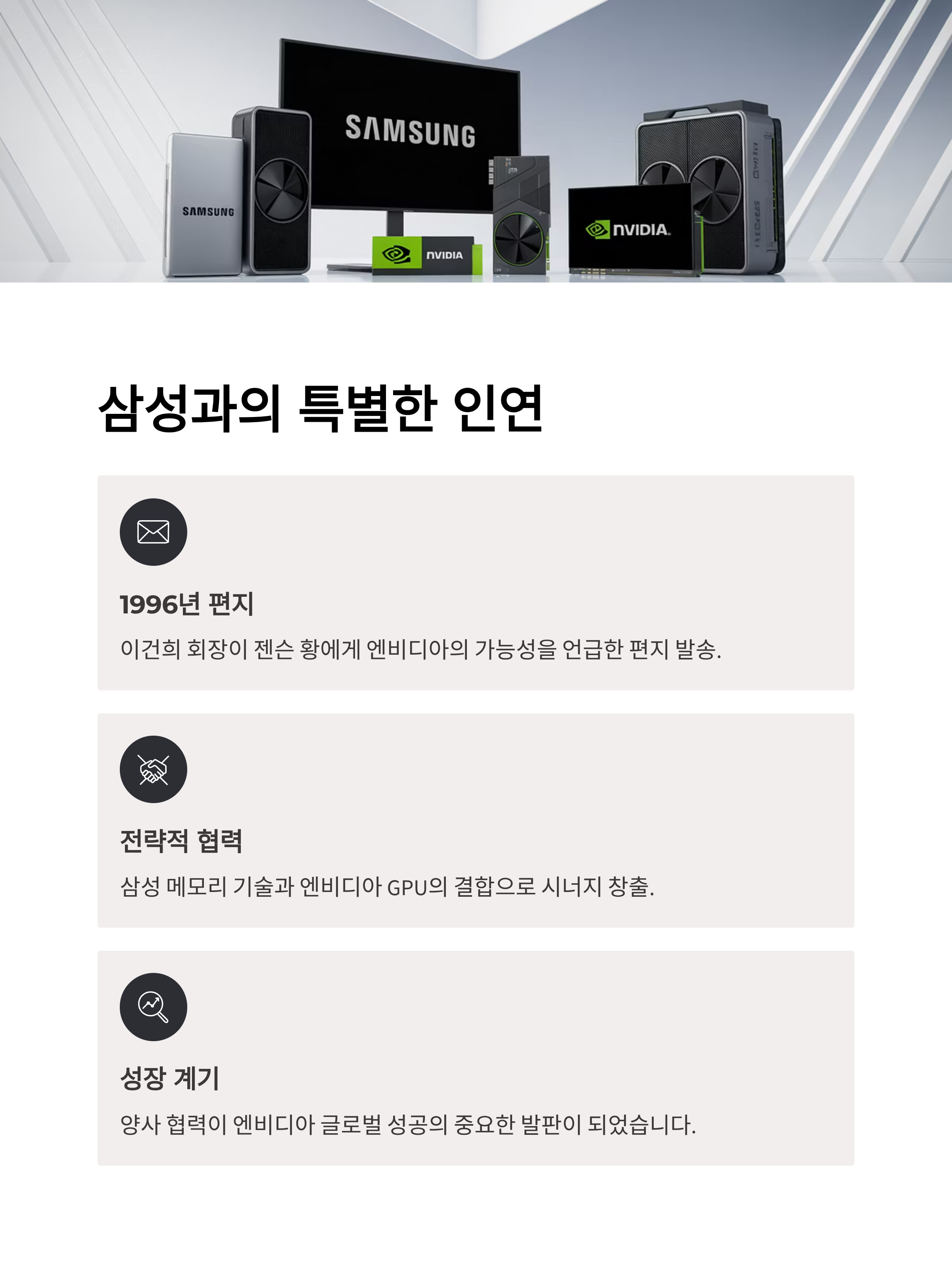 - 삼성의 이건희 회장은 1996년 젠슨 황에게 엔비디아의 가능성에 주목한 편지를 보낸 적이 있을 만큼 양사의 관계가 유의미했습니다.