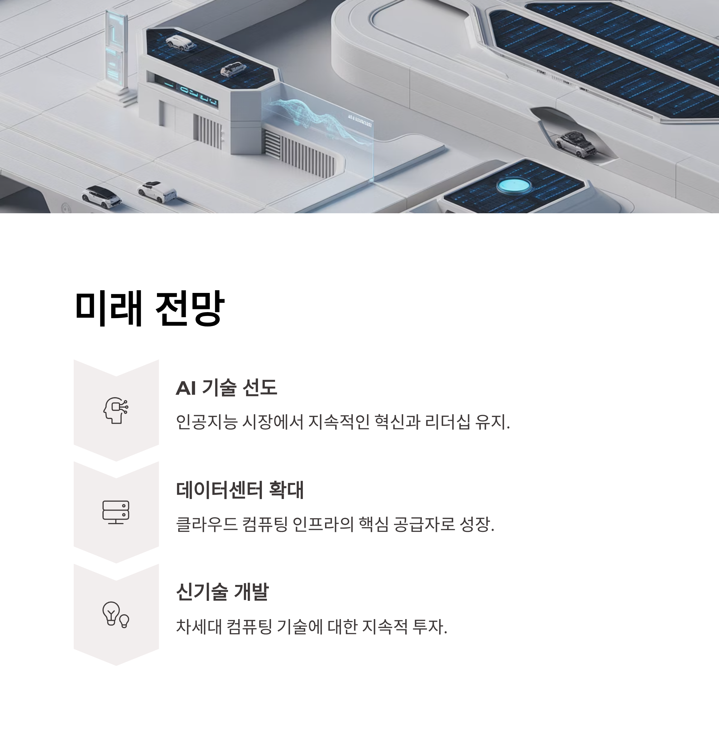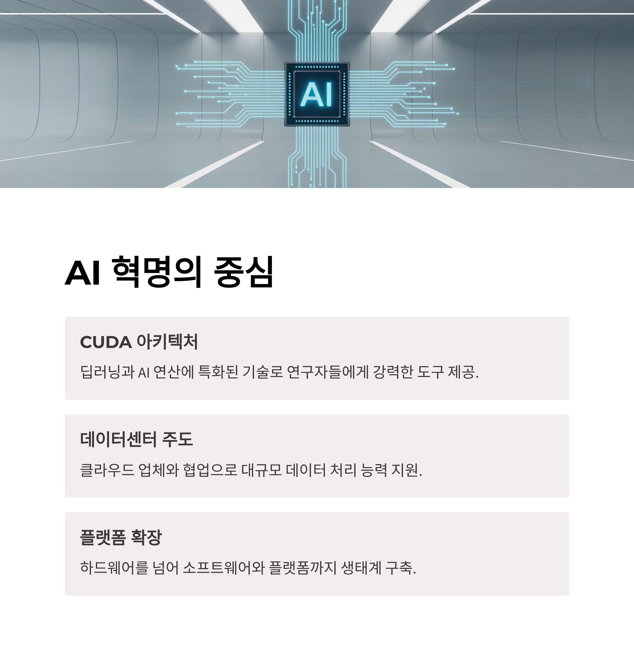 엔비디아는 GPU 기술을 AI와 데이터센터 시장에 적용함으로써 기술의 새로운 패러다임을 만들어냈습니다. 딥러닝과 인공지능 연산에 특화된 CUDA 아키텍처는 AI 연구자들에게 강력한 도구가 되었으며, 클라우드 제공업체와의 협업을 통해 대규모 데이터 처리 능력을 지원했습니다. 이 과정에서 엔비디아의 성장 전략은 단순한 하드웨어 판매가 아니라, 소프트웨어와 플랫폼 제공까지 확장되었습니다. 이는 다양한 산업 분야에서 GPU 기술을 활용할 수 있는 생태계를 만드는 데 중요한 역할을 했습니다. 현재 엔비디아는 게임, 헬스케어, 자율주행차, 금융 등 다방면에서 기술 혁신을 이끌고 있습니다.