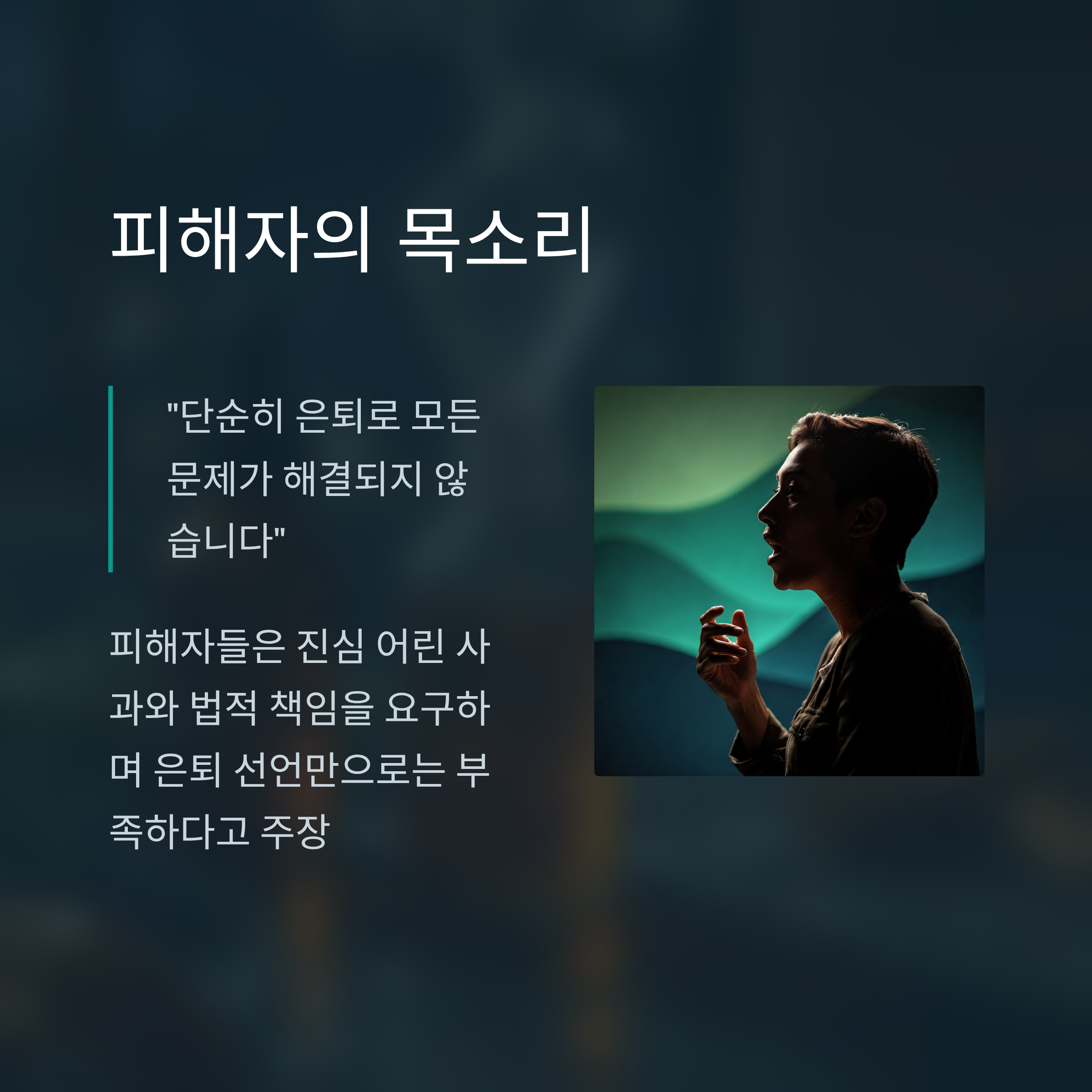조진웅의 은퇴 선언은 사건에 대한 도피로 보일 수도 있지만, 일부 대중은 이를 일종의 책임감 있는 선택으로 간주했다. 하지만 이와 대조적으로 피해자들과 일부 여론은 단순히 은퇴로 모든 문제가 해결되지 않는다고 주장한다. "일단 물러나겠다"는 식의 선언이 그의 의혹에 대한 명확한 해명이 되지는 않기 때문이다. 특히 대중은 그의 반성의 진정성을 의심하며, 은퇴 대신 피해자와의 공식적인 화해와 법적 책임을 촉구하고 있다.