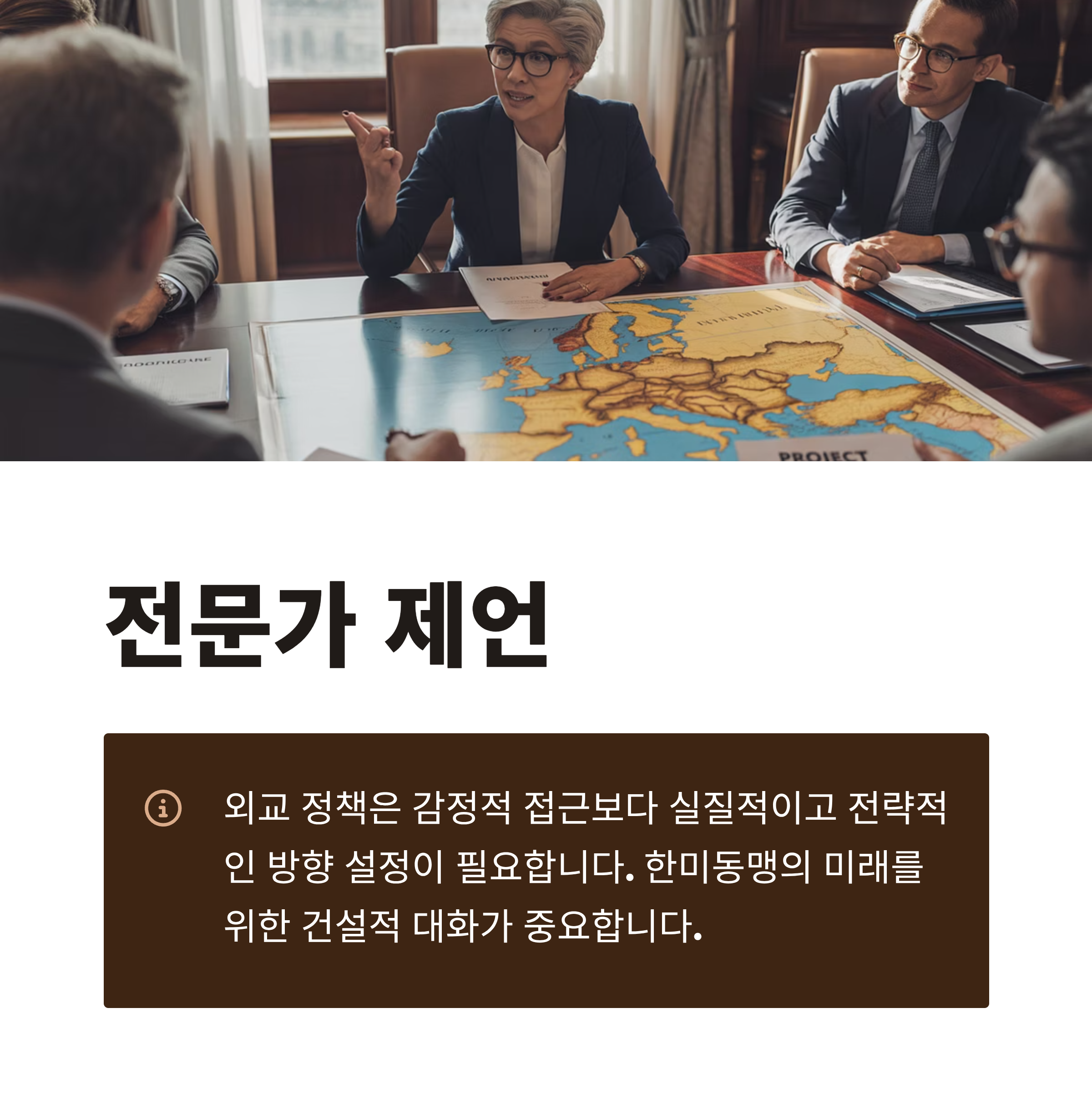 5. 외교 정책은 반미 정서를 조장하기보다 실질적이고 전략적인 방향 설정이 필요하다는 목소리가 높아지고 있습니다.
