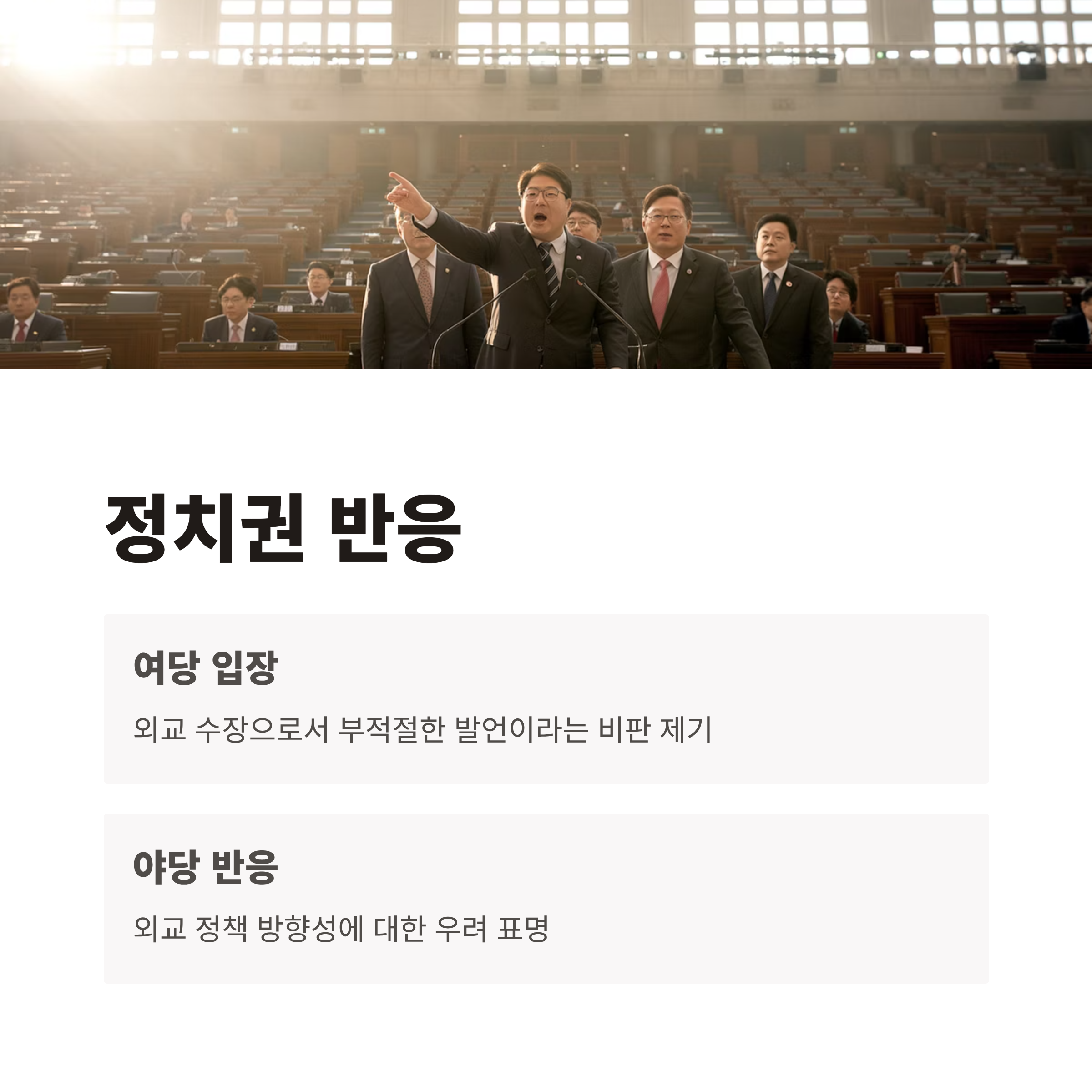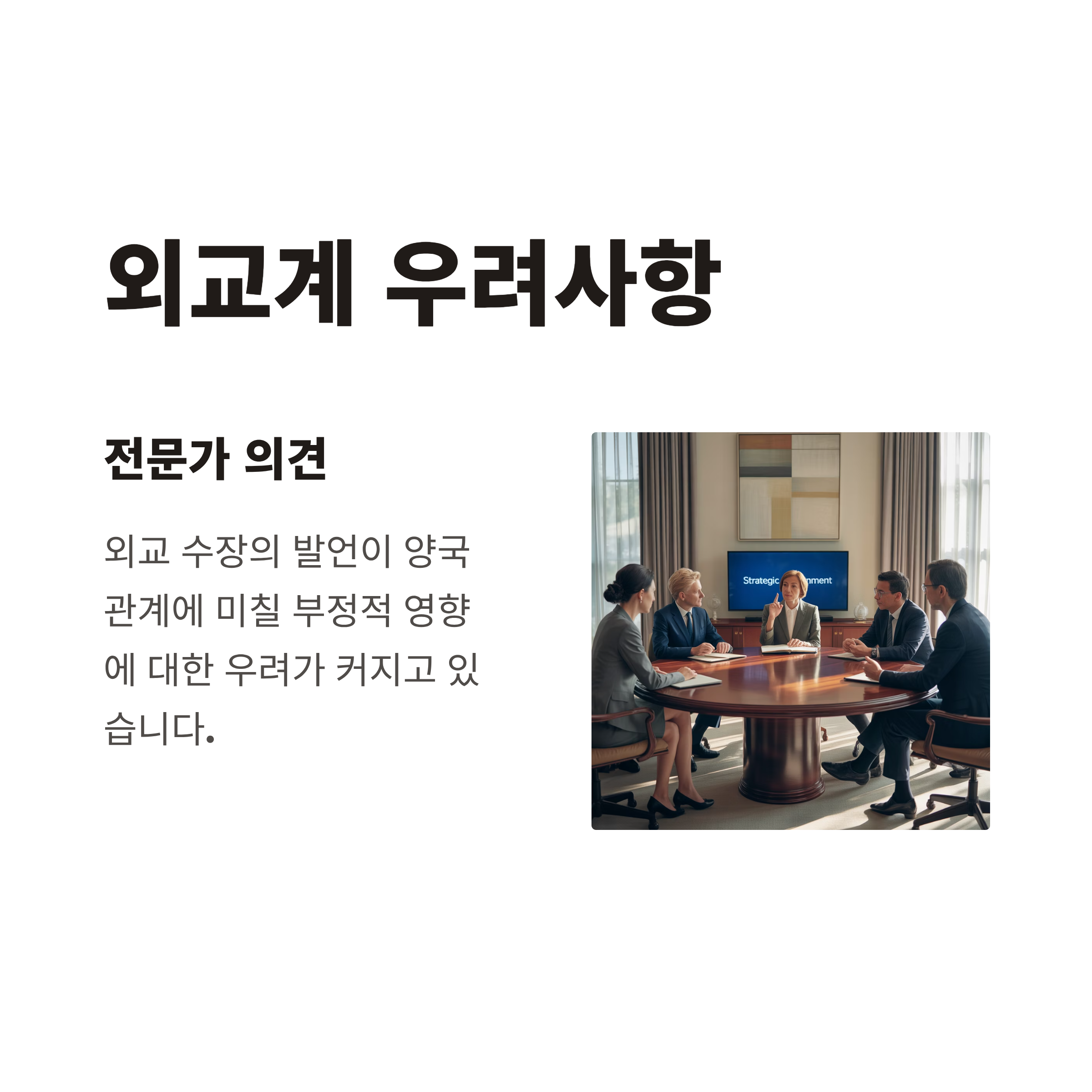 2. 정치권 및 외교계에서는 이러한 발언이 외교수장으로서 부적절했다는 비판이 제기되고 있습니다.