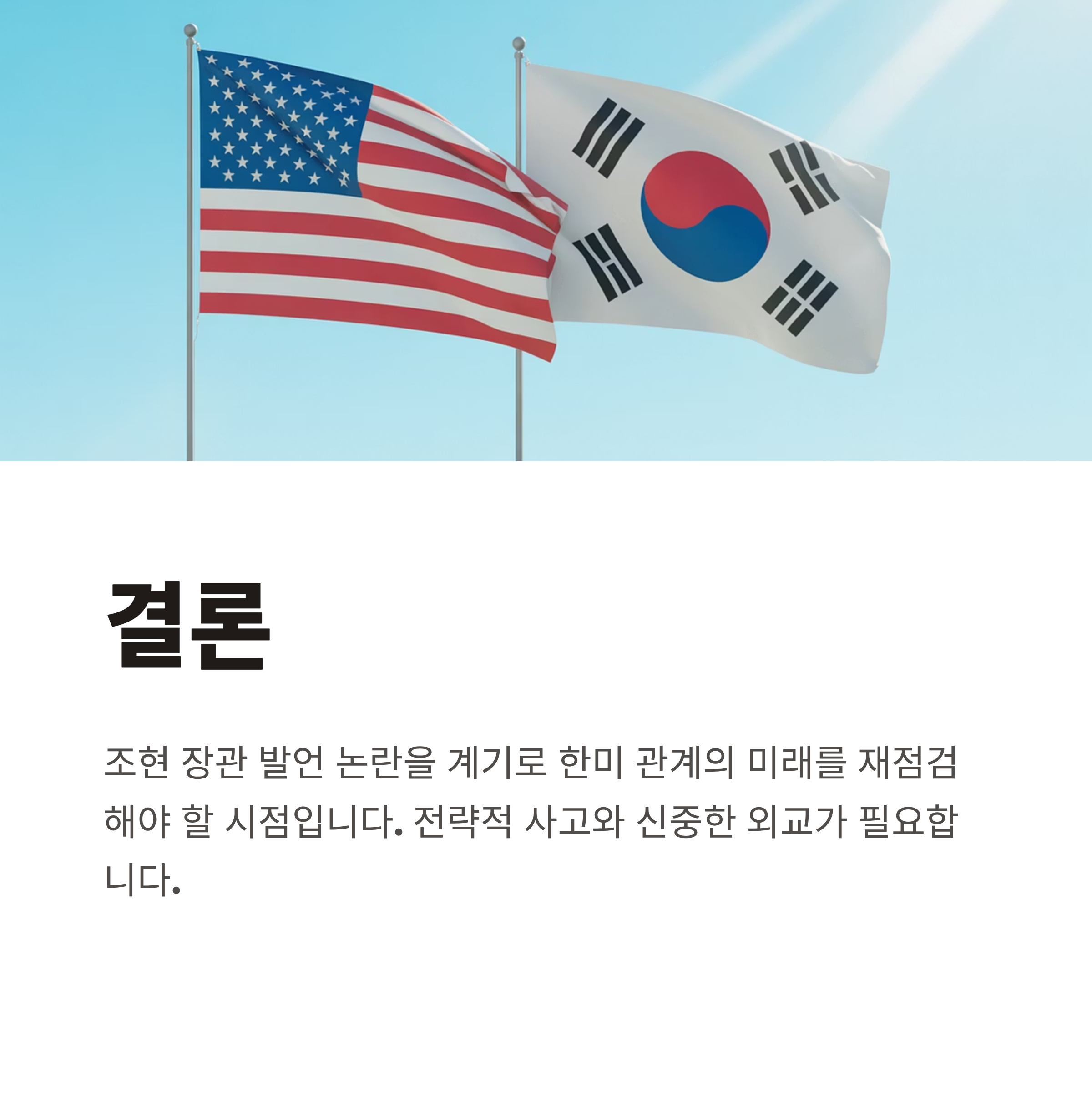 조현 외교부 장관의 발언은 국제 변화 속에서 신중한 외교 정책의 중요성을 다시 한번 상기시켰습니다. 미국과의 관계는 한국 외교의 핵심 축으로, 긴장이 아닌 상호 신뢰와 협력을 바탕으로 관리되어야 할 영역입니다. 현재의 경제, 안보, 외교 도전 과제들은 독립적인 접근보다는 동맹과 협력을 통한 실질적 해법에 중점을 둬야 할 것입니다.